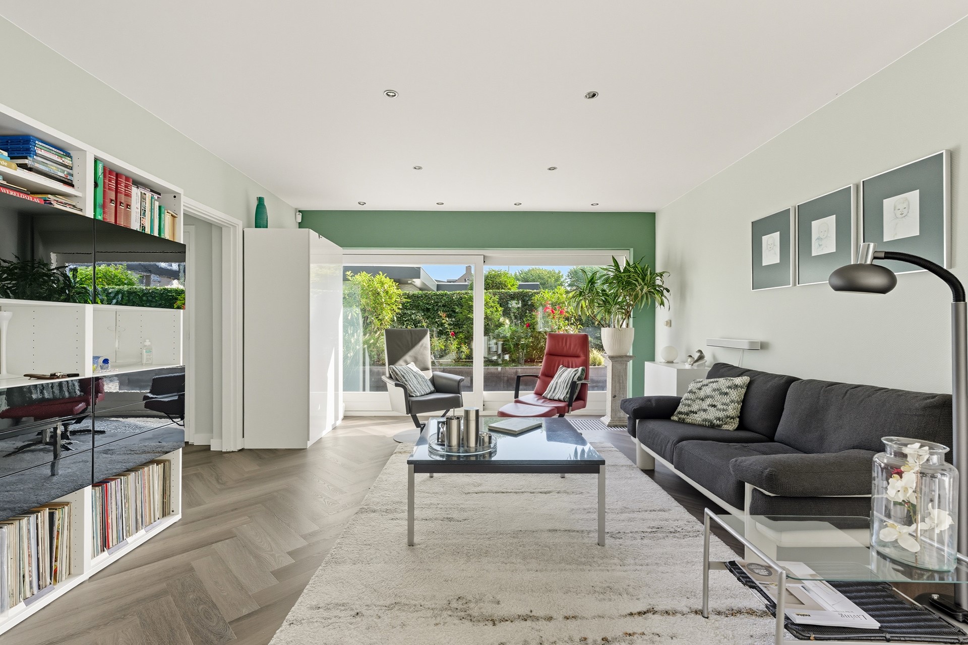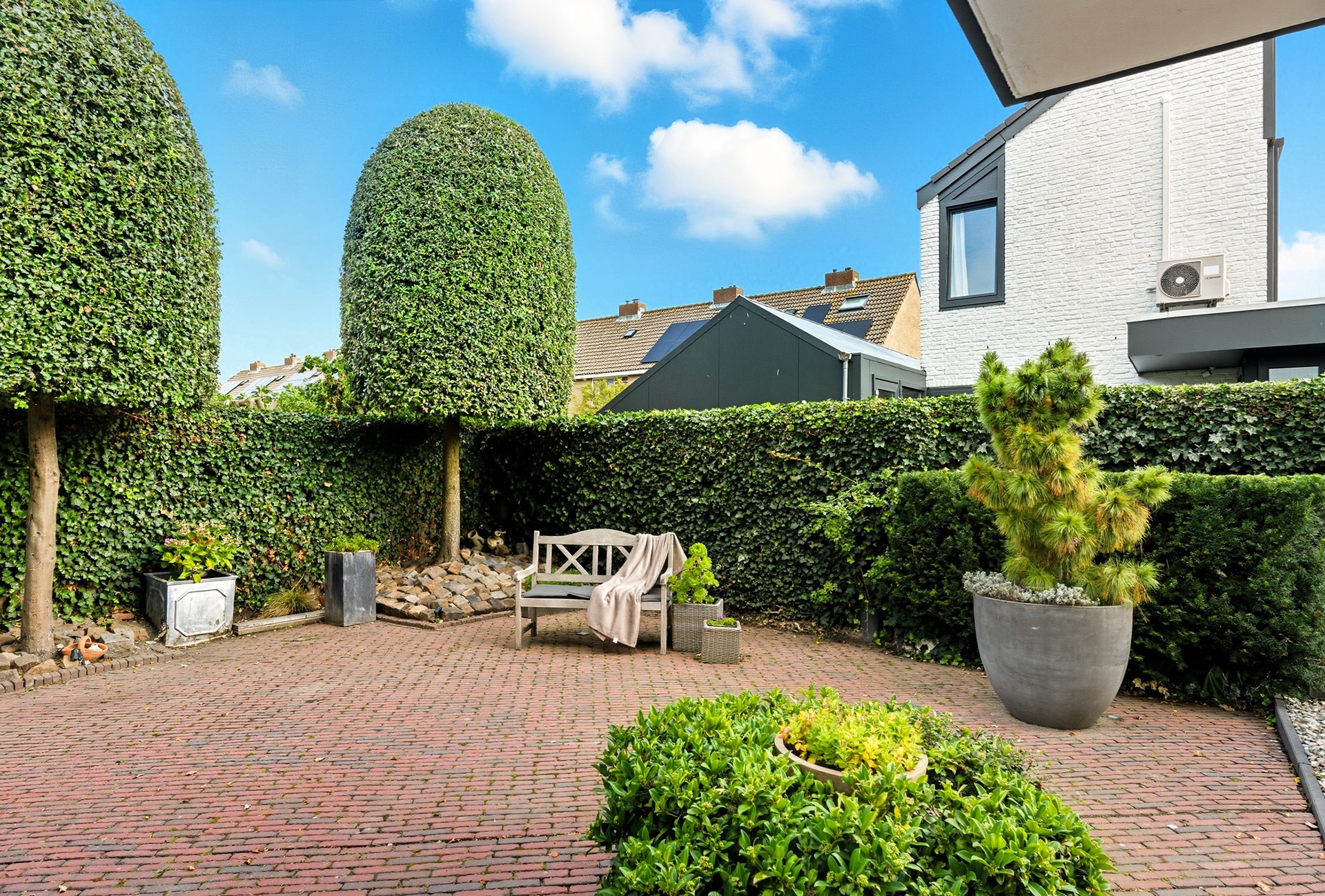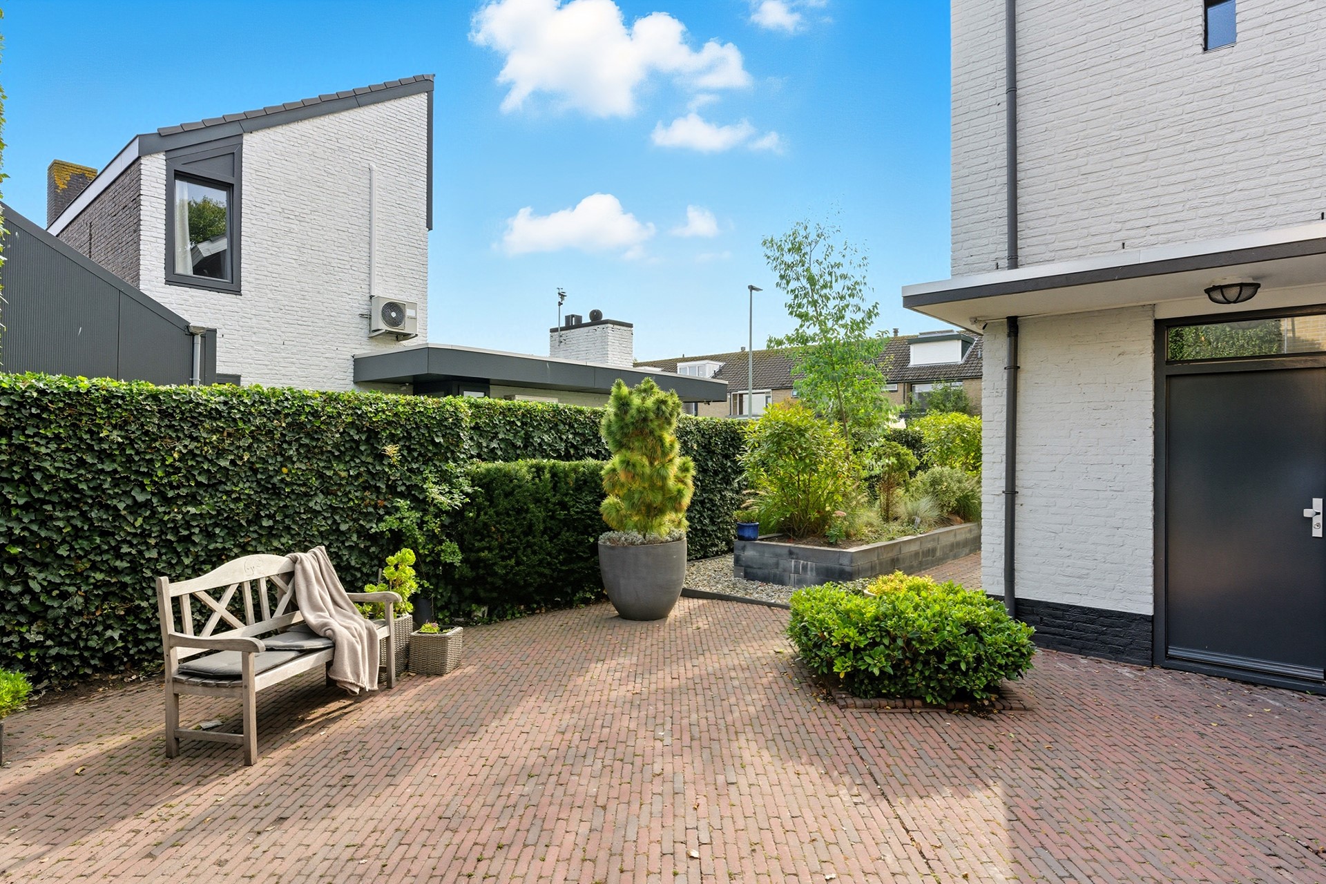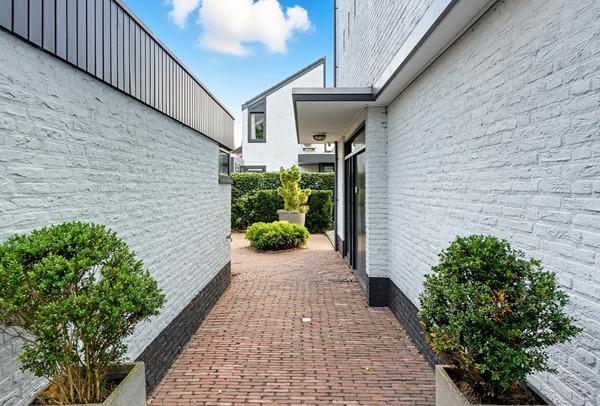 Rondom de woning ligt een fraaie, groene en privacyvolle tuin met meerdere terrassen. Achter de woning staat de dubbele garage met plek voor twee auto’s en veel berging. Voor de garage zijn twee extra parkeerplekken aanwezig.