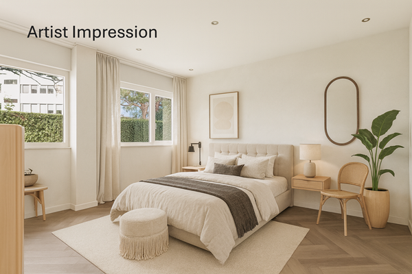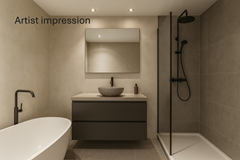 Drie ruime slaapkamers, allemaal met toegang tot een balkon – ideaal voor gezinnen met kinderen die graag hun eigen ruimte hebben. De master bedroom heeft een badkamer ensuite met inloopdouche, dubbele wastafel en toilet. Daarnaast is er nog een moderne tweede badkamer én een separaat toilet. Overal een luxe uitstraling en een mooie marmerlook vloer.