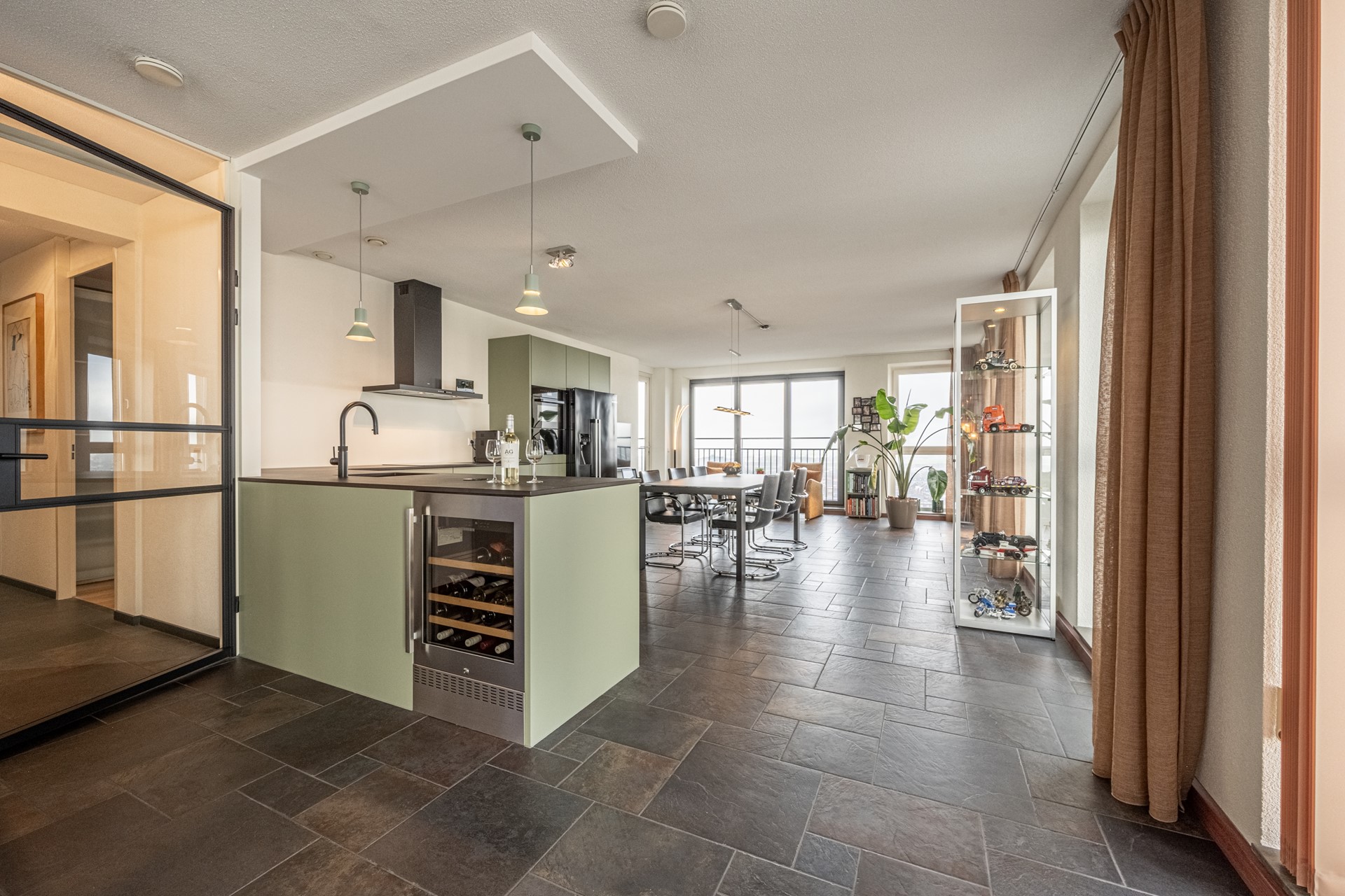 Vanuit de woonkeuken heb je toegang tot het balkon op het noordwesten. Dankzij de glazen zijpui kun je hier – zelfs op grote hoogte heerlijk beschut buiten zitten. Frisse lucht en uitzicht.