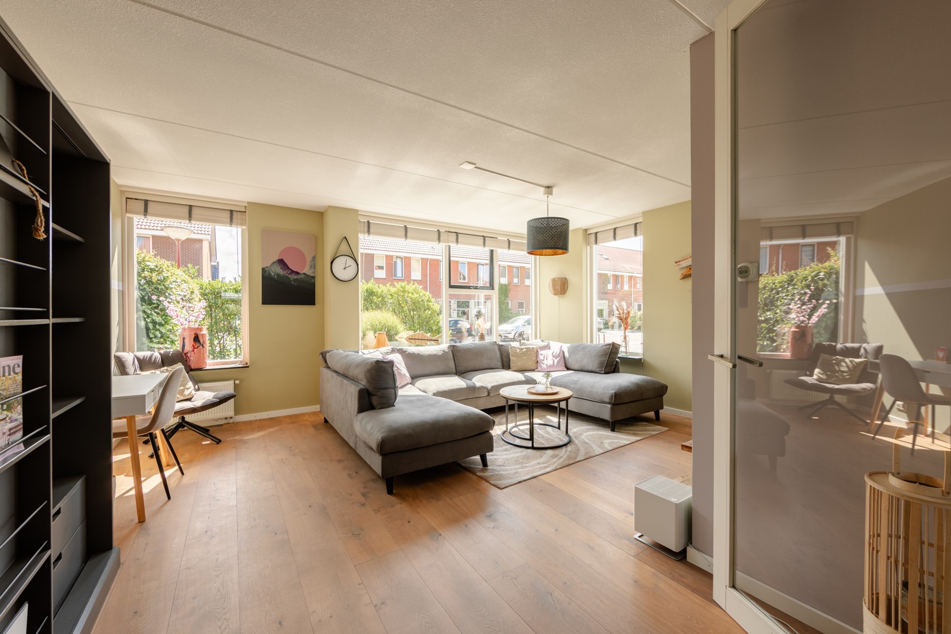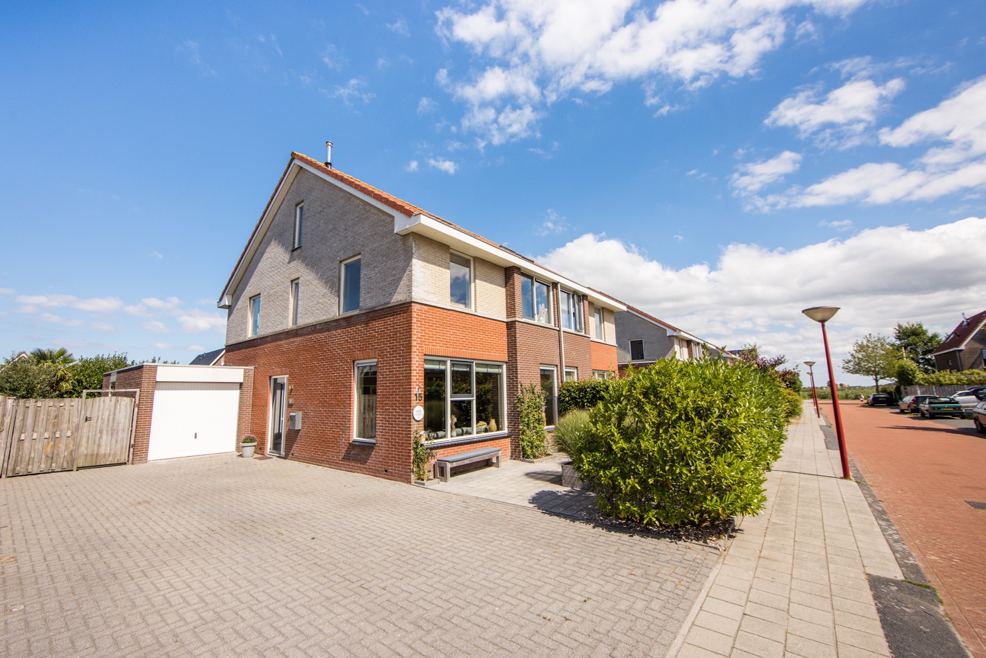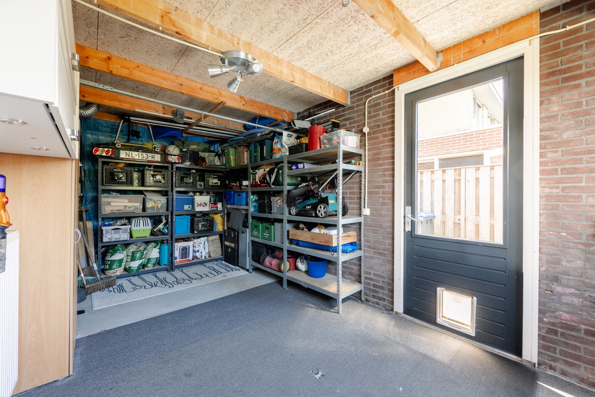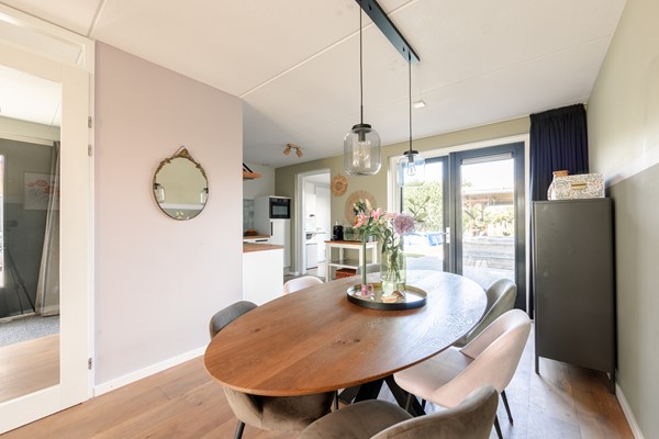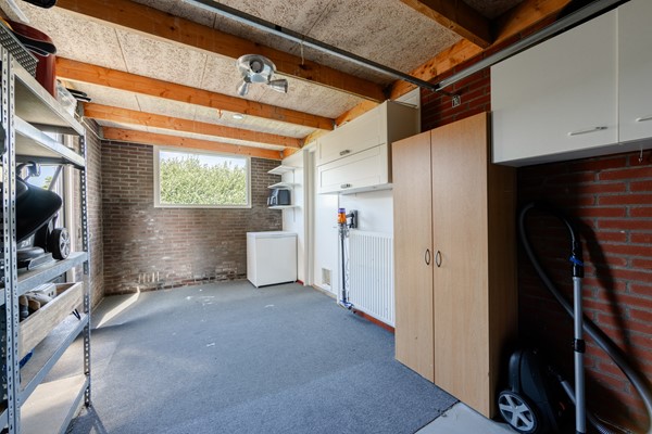 Aan de voorzijde heb je een brede en lange oprit waar je wel vier auto’s kwijt kunt. En er is een garage. Via de hal met toilet kom je in de ruime, lichte L-vormige woonkamer met een massief eikenhouten vloer en openslaande deuren naar het zitgedeelte en de tuin. De halfopen keuken is gereviseerd en voorzien van diverse nieuwe inbouwapparatuur. In de bijkeuken met vloerverwarming en een wasmachineaansluiting bevindt zich een deur naar de garage.