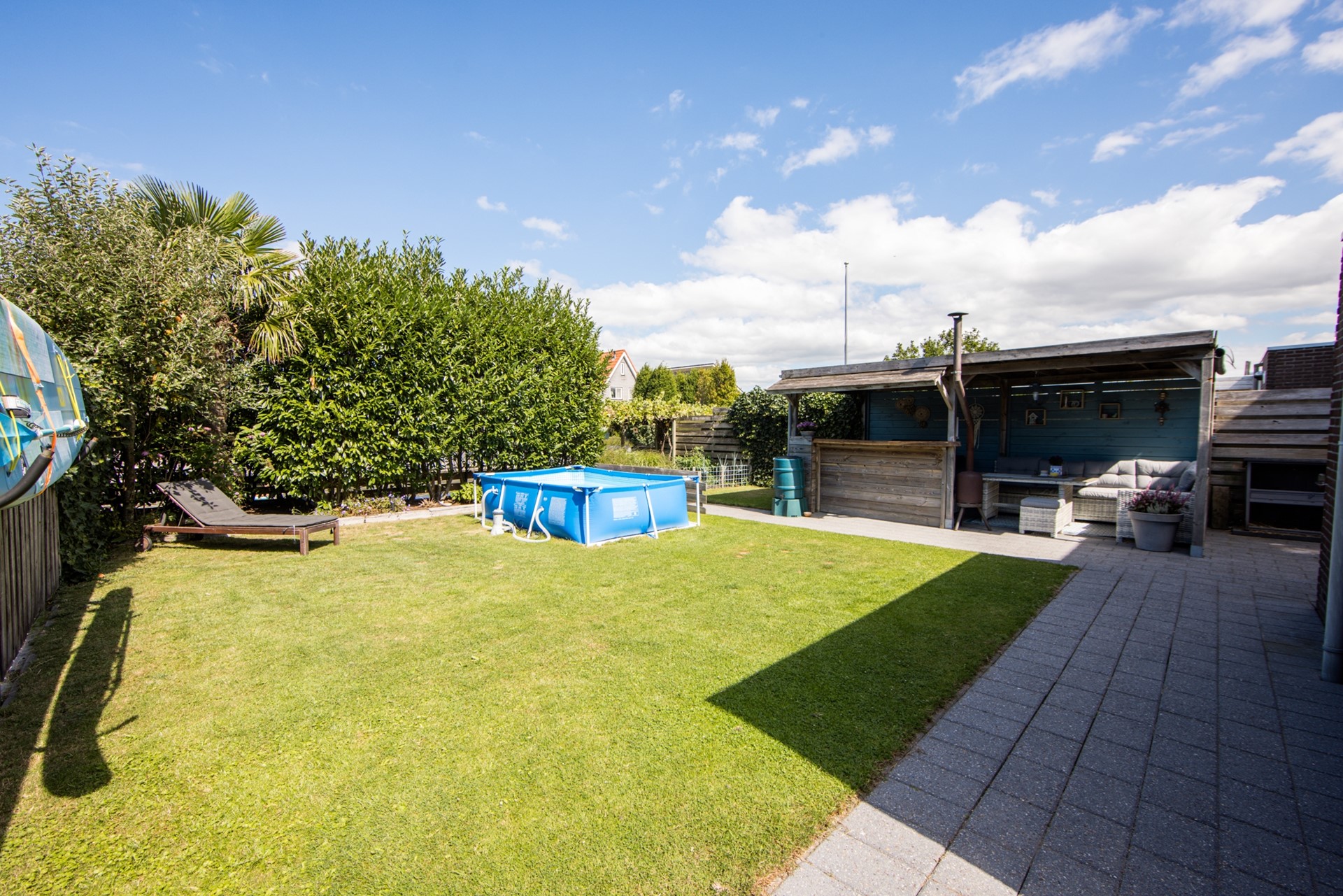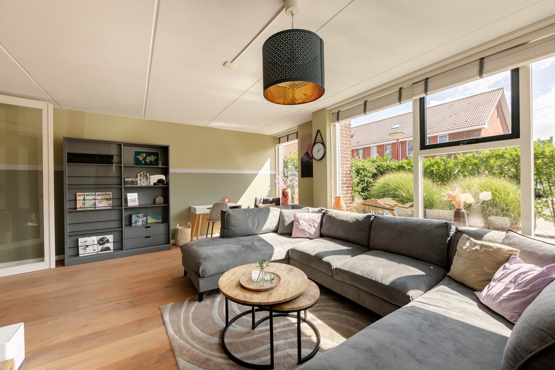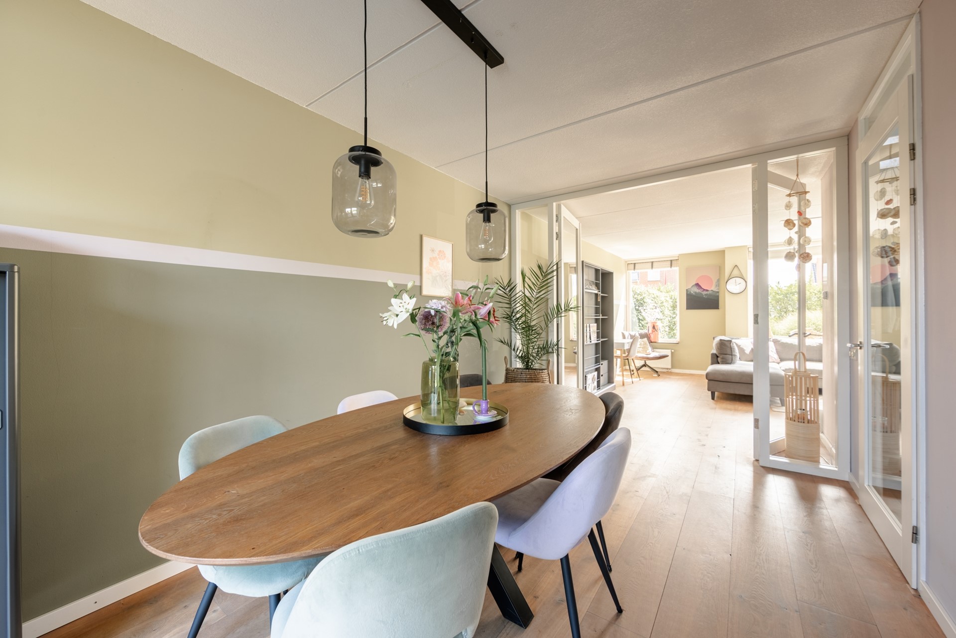 Aan de voorzijde heb je een brede en lange oprit waar je wel vier auto’s kwijt kunt. En er is een garage. Via de hal met toilet kom je in de ruime, lichte L-vormige woonkamer met een massief eikenhouten vloer en openslaande deuren naar het zitgedeelte en de tuin. De halfopen keuken is gereviseerd en voorzien van diverse nieuwe inbouwapparatuur. In de bijkeuken met vloerverwarming en een wasmachineaansluiting bevindt zich een deur naar de garage.