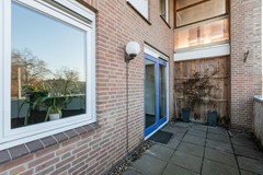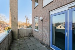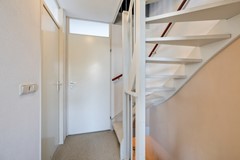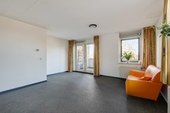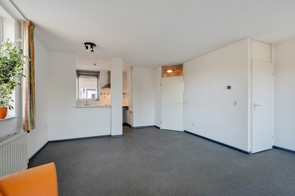 In de hal bevinden zich de meterkast, het toilet, een videofoon, en een doorgang naar de woonkamer en keuken. Tevens leidt een vaste trap naar de tweede woonlaag. De lichte woonkamer van circa 25 m² is voorzien van een siergrindvloer, houten kozijnen met isolerende beglazing. Deze ruimte beschikt over een praktische bergkast voor extra opbergruimte. Vanuit de woonkamer is er toegang tot het op het zuidwesten gelegen dakterras, dat ongeveer 12 m² groot.