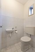 De volledig betegelde badkamer heeft een ligbad waarin gedoucht kan worden, radiator, wastafel, mechanische ventilatie en een 2de toilet.