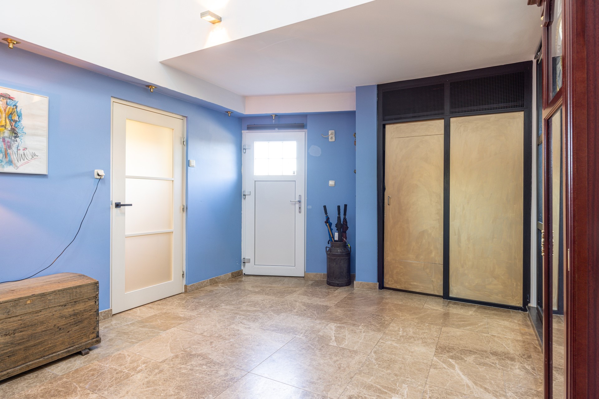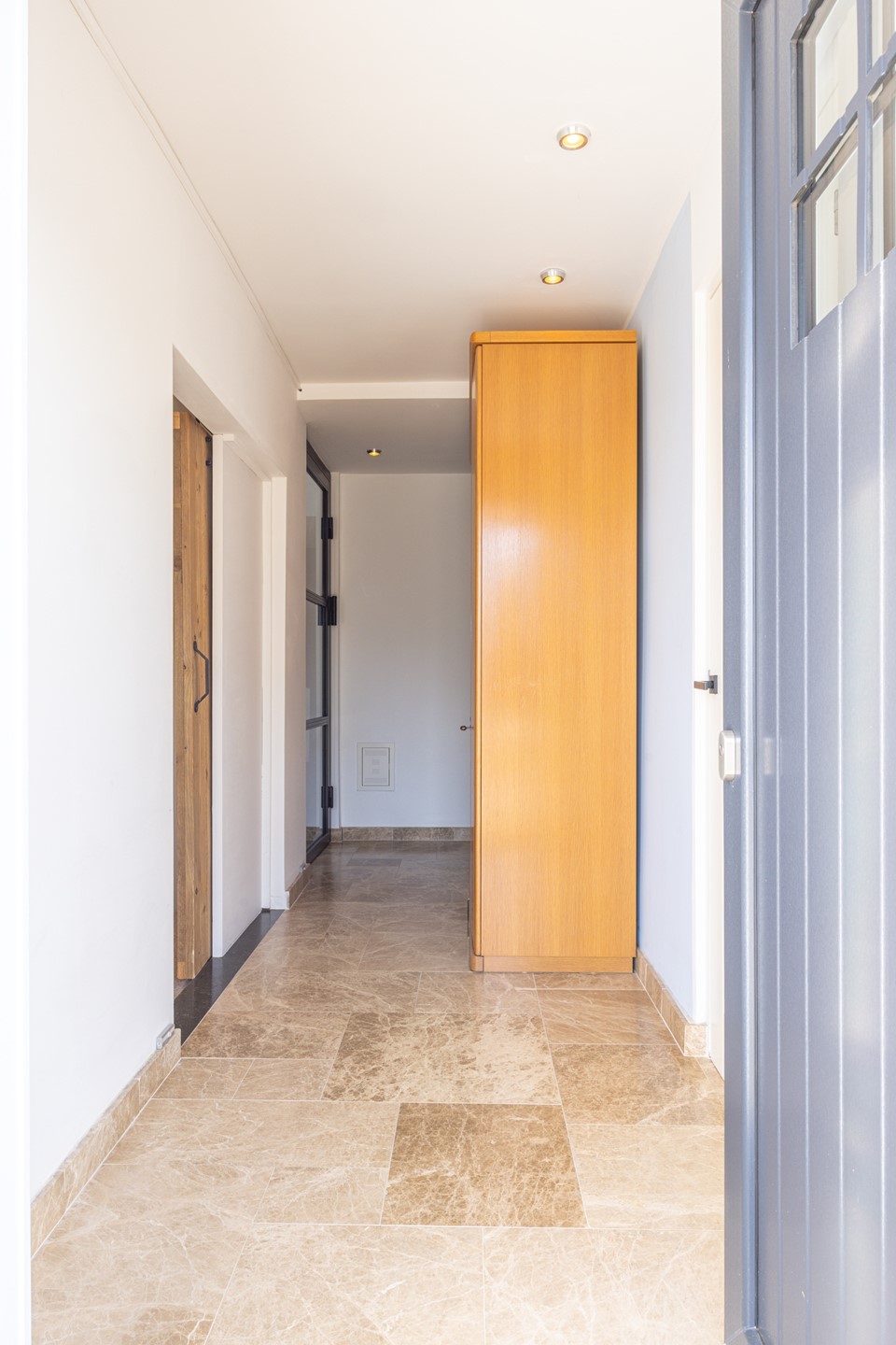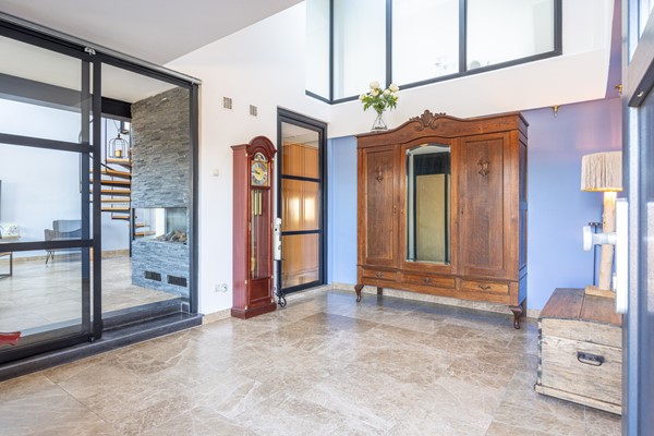 De woning beschikt over een entree aan de voorzijde, maar ook over een ruime ontvangst aan de achterzijde waar tevens parkeergelegenheid aanwezig is. Via deze achterzijde betreed je de woning in een royale ontvangsthal. De tegelvloer en de hoogte van de ruimte zorgen direct voor een ruimtelijk gevoel. In deze hal bevindt zich een ingebouwde garderobekast. Vanuit hier is via een stalen deur toegang tot de hal bij de voordeur en via een stalen schuifdeur tot de woonkamer.