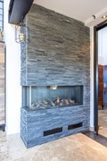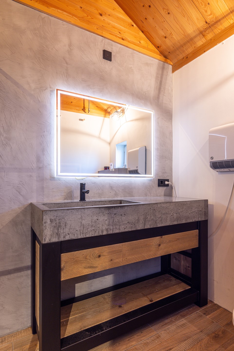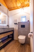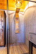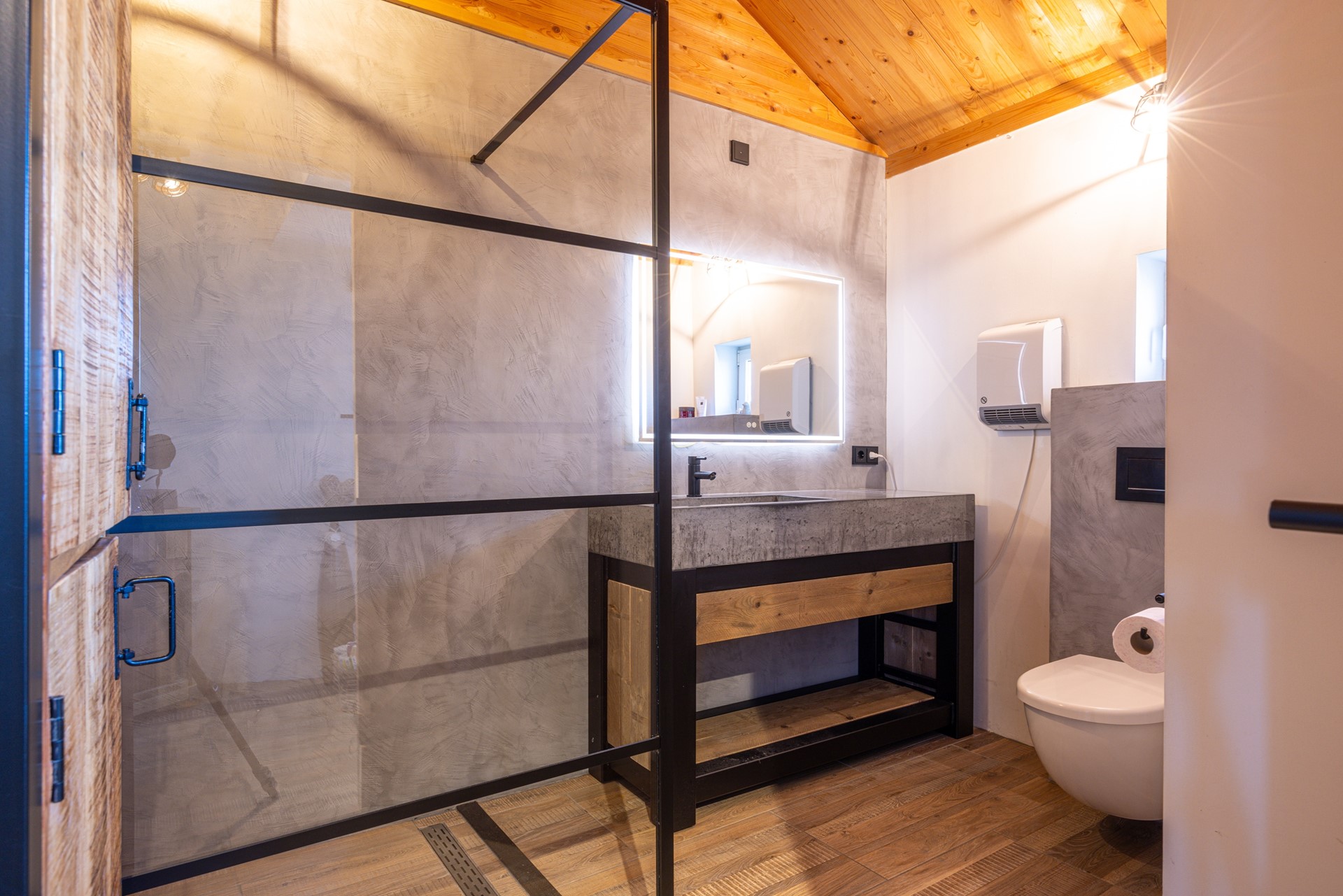 De badkamer is stijlvol ingericht en beschikt over een ruime inloopdouche met regendouche, een tweede zwevend toilet en een extra breed badkamermeubel met wastafel en een verlichte spiegel. De combinatie van robuuste materialen en de strakke afwerking geeft de ruimte een eigentijdse en luxe uitstraling. Dankzij de royale hoogte voelt de badkamer bovendien ruim en comfortabel aan.