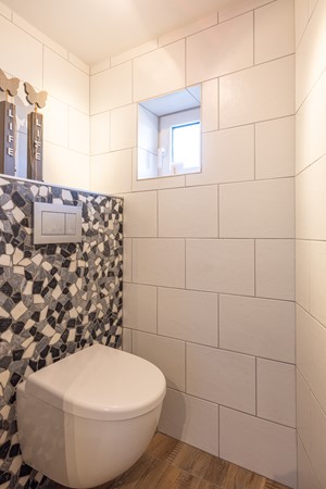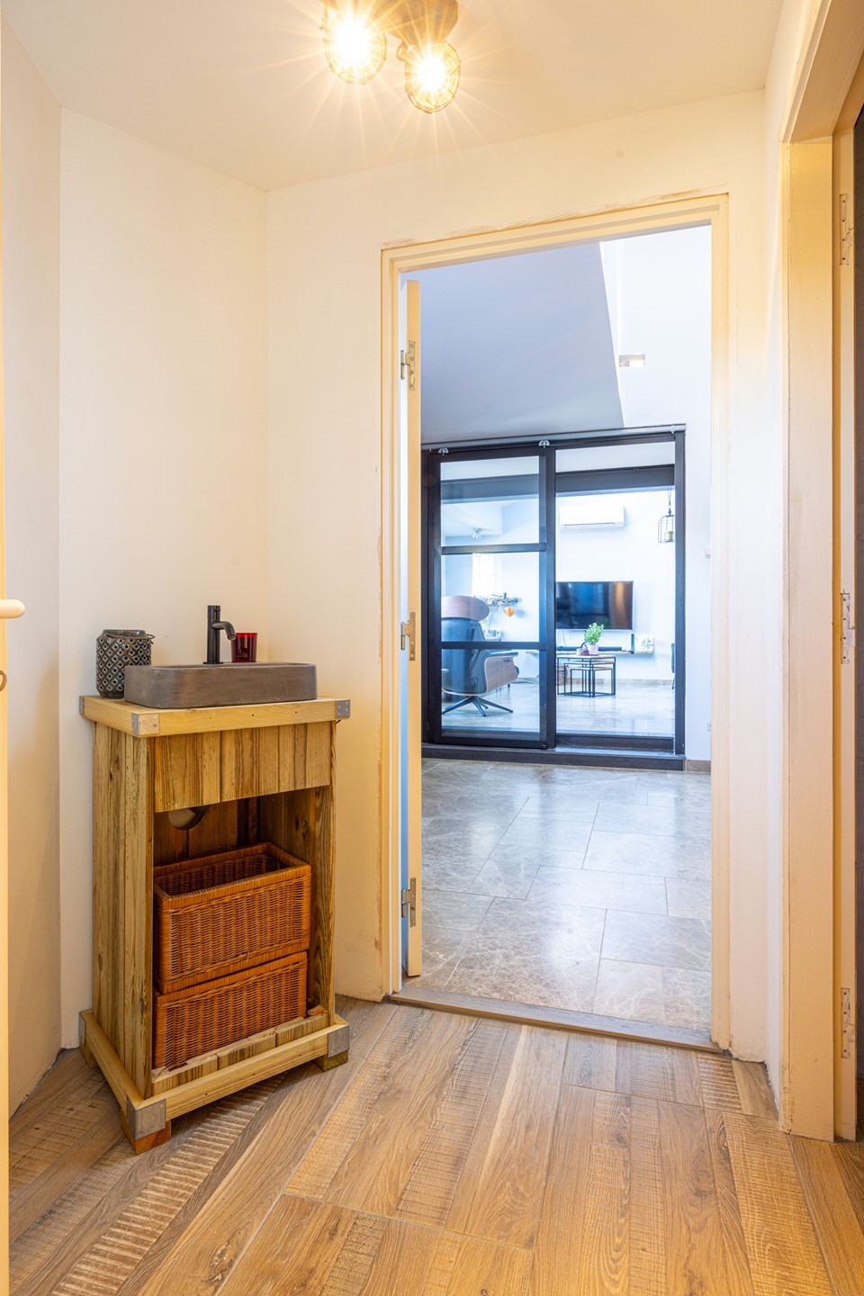 Vanuit de centrale hal aan de achterzijde van de woning is een tussenportaal bereikbaar dat toegang biedt tot het sanitair. In dit tussenportaal bevindt zich een wastafelmeubel met waskom.