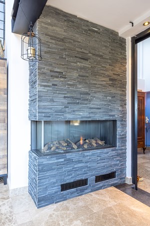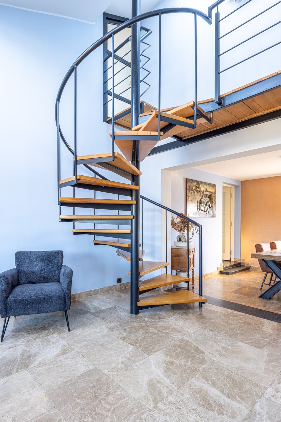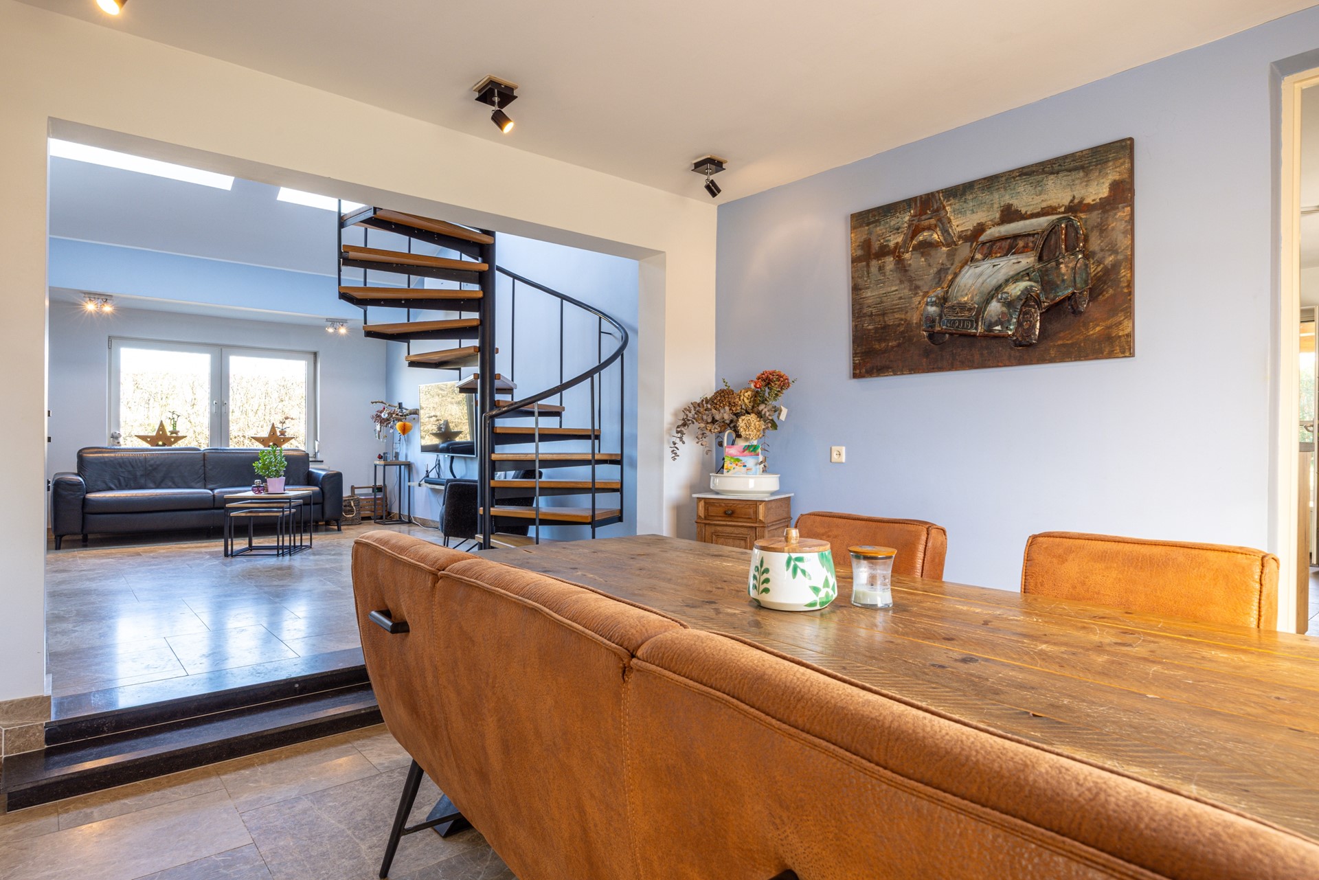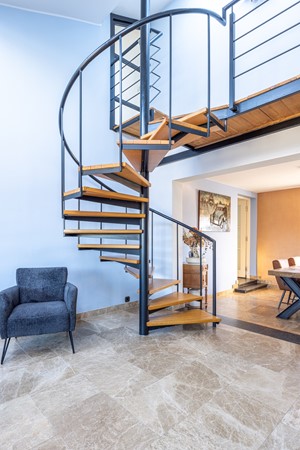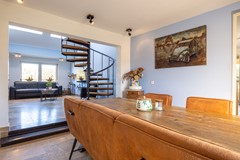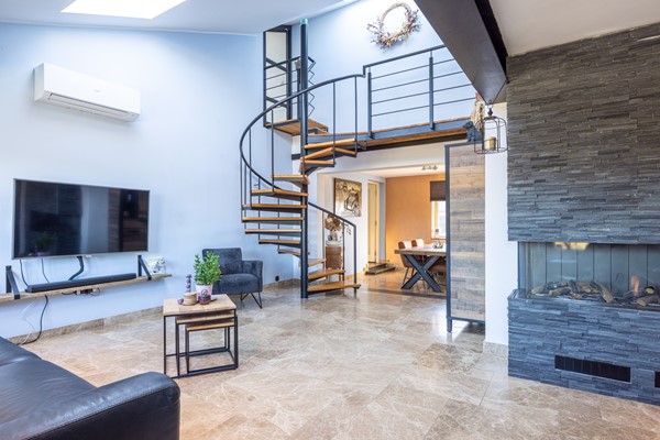 De gashaard zorgt voor een aangename sfeer tijdens de koudere maanden en vormt een fraai element in de ruimte. Daarnaast is er een airco-installatie aanwezig die zowel kan koelen als verwarmen, wat het comfort gedurende het hele jaar ten goede komt. Het raam van de woonkamer is bovendien voorzien van een rolluik. De wenteltrap naar de tweede verdieping geeft de woonkamer een speels karakter en benadrukt de hoogte van de ruimte. Door de open verbinding met de eetkamer ontstaat een fijne leefruimte.