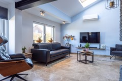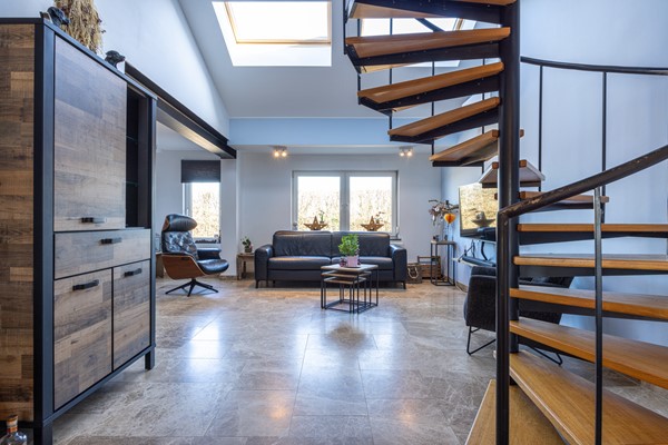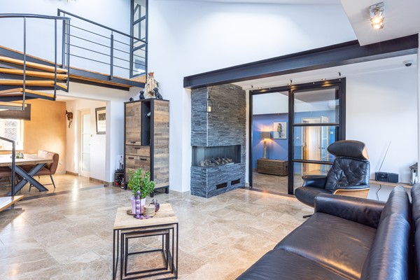 De woonkamer vormt zonder twijfel het centrale en meest indrukwekkende deel van de woning. Zodra je deze ruimte binnenstapt valt direct de hoogte van het plafond op, wat in combinatie met de vide zorgt voor een bijzonder ruimtelijk effect. De grote raampartijen en dakramen laten veel daglicht binnen, waardoor de ruimte gedurende de dag een lichte en open sfeer heeft. De tegelvloer loopt door vanuit de hal en vormt een mooi geheel met de rest van de begane grond.