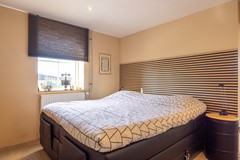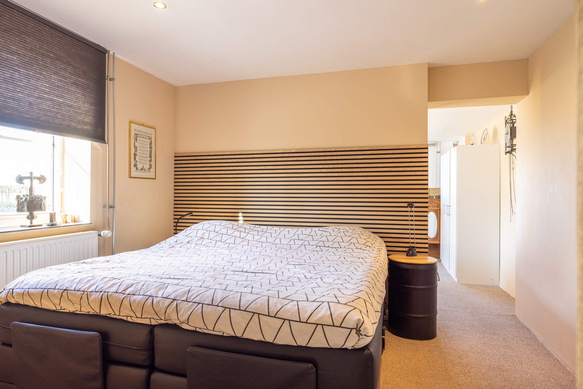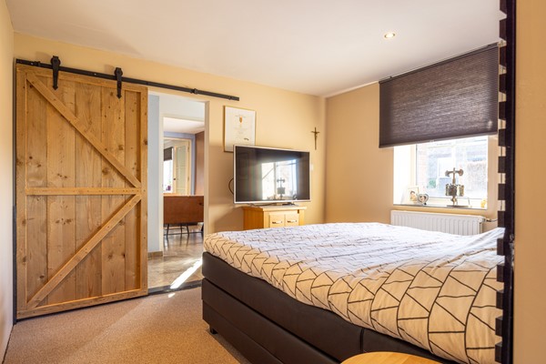 Via de hal bij de voordeur is een slaapkamer bereikbaar die is gelegen aan de voorzijde van de woning. Deze kamer beschikt over een landelijke schuifdeur en is afgewerkt met een tapijtvloer.