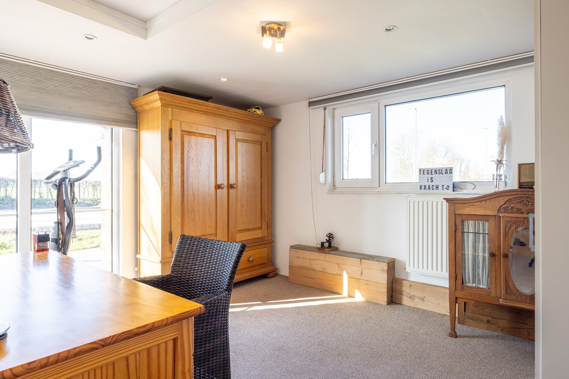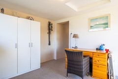Vanuit de slaapkamer is een tweede kamer bereikbaar die momenteel wordt gebruikt als kantoorruimte. De tapijtvloer loopt door vanuit de slaapkamer, waardoor een mooi geheel ontstaat. De ruimte beschikt aan de voorzijde van de woning over een groot raam van grond tot plafond dat zorgt voor veel daglicht. Daarnaast bevindt zich in de zijgevel een raam dat is voorzien van een rolluik. Deze kamer is zeer geschikt als thuiskantoor, maar kan ook worden ingericht als bijvoorbeeld een inloopkast of hobbyruimte. Vanuit deze kamer is via een vlizotrap toegang tot een bergzolder, ideaal voor het opbergen van extra spullen.