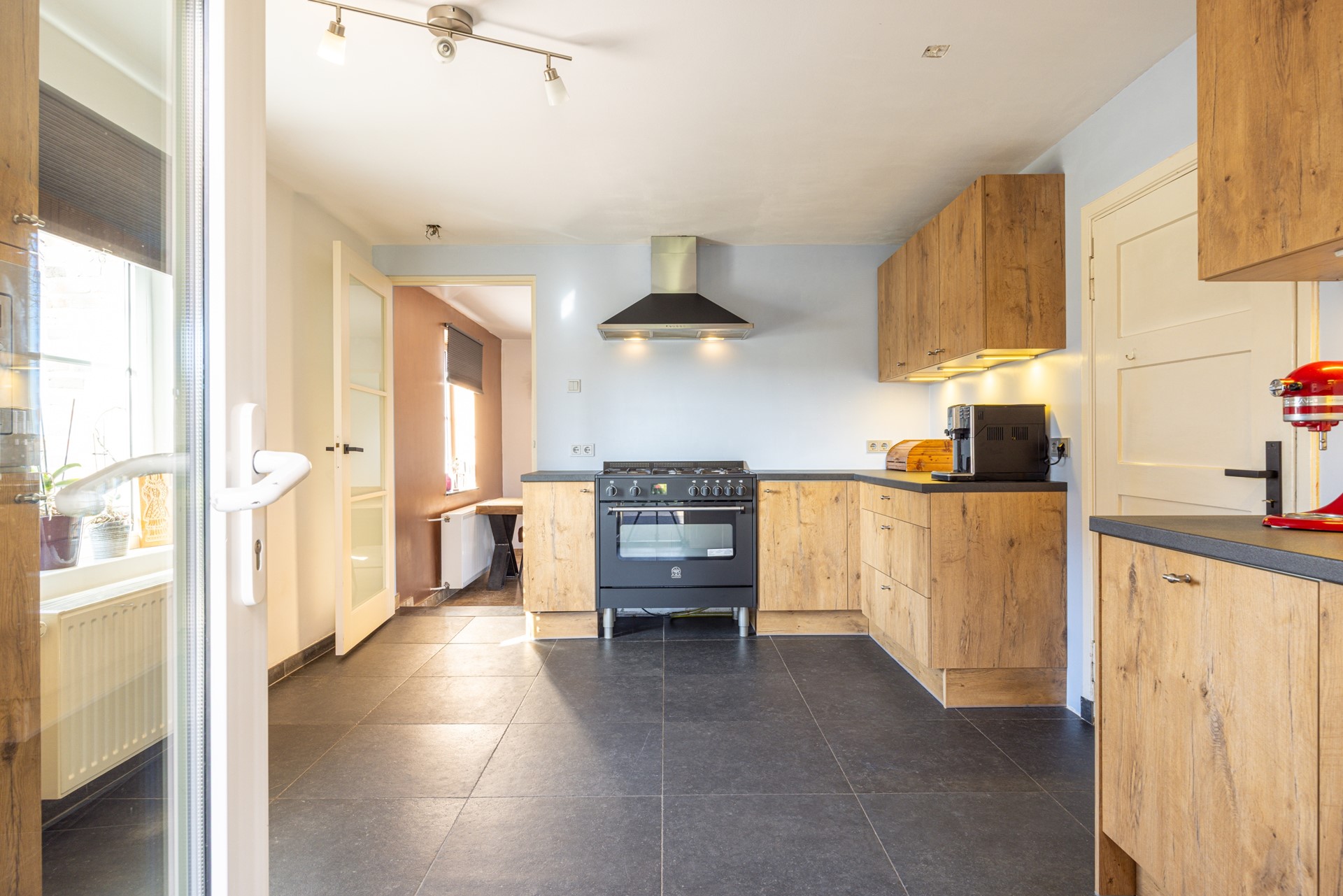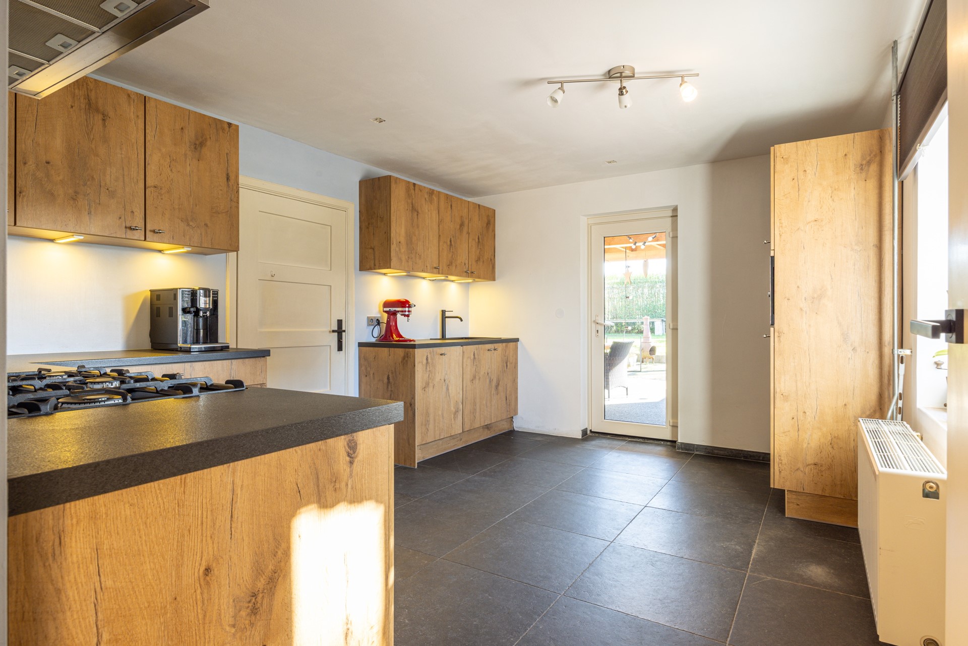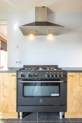 De gesloten keuken is uitgevoerd in een landelijke stijl en beschikt over meerdere keukenblokken, waardoor er veel werk- en bergruimte aanwezig is. De keuken is voorzien van een vrijstaand Bertazzoni fornuis met vijf gasbranders, waaronder een wokbrander, en een oven. Daarnaast zijn er een afzuigkap, vaatwasser, koelkast en magnetron aanwezig. Vanuit de keuken is er directe toegang tot de inpandige garage en tot het overdekte terras in de achtertuin.