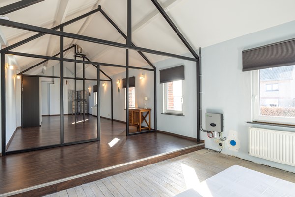 De verdieping is momenteel ingericht als één grote open ruimte, maar biedt uitstekende mogelijkheden om hier een slaapkamer en een royale master bedroom met en-suite badkamer te realiseren. Daarnaast is het ook goed mogelijk om de verdieping anders in te delen, bijvoorbeeld door het creëren van twee slaapkamers met een separate badkamer. Een groot deel van de vloer is al voorzien van een laminaatvloer en de aansluitingen voor water en afvoer zijn reeds voorbereid. Ook de stalen constructie voor een mogelijke indeling van de ruimte is al aanwezig, waardoor de basis voor verdere afwerking al is gelegd.