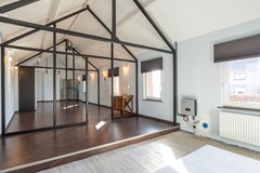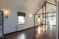 Via de wenteltrap in de woonkamer wordt de tweede verdieping bereikt. Direct bij bovenkomst valt de ruimtelijkheid van deze verdieping op. De open kapconstructie in combinatie met de stalen draagconstructie geeft de ruimte een bijzonder karakter en zorgt voor een moderne en loftachtige uitstraling. Dankzij de aanwezige dakramen op de overloop en de ramen in de zijgevel valt er veel daglicht binnen, waardoor de ruimte een lichte en aangename sfeer heeft.