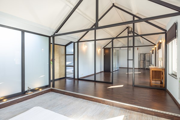 De hoogte van het plafond en de zichtbare constructie geven deze verdieping een uniek karakter. Daarnaast is ook hier een airco-installatie aanwezig die kan koelen en verwarmen, wat bijdraagt aan een aangenaam wooncomfort gedurende het hele jaar.