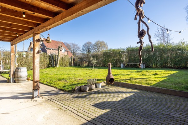 De tuin bevindt zich aan de zijkant van de woning en vormt een ruime buitenomgeving. Vanuit de keuken is er directe toegang tot het overdekte terras dat direct naast de woning is gelegen. Deze royale overkapping is ingericht als sfeervolle buitenruimte met voldoende plaats voor een comfortabele zit- en eethoek, waardoor het een fijne plek is om beschut buiten te zitten en te genieten van lange zomeravonden. Aansluitend aan de overkapping ligt een tweede terras in de open lucht. Hierdoor is er altijd een plek te vinden in de zon of juist in de schaduw. Vanuit het terras kijk je uit over het ruime gazon dat het grootste deel van de tuin vormt. De tuin wordt omgeven door groene hagen en volwassen beplanting.
