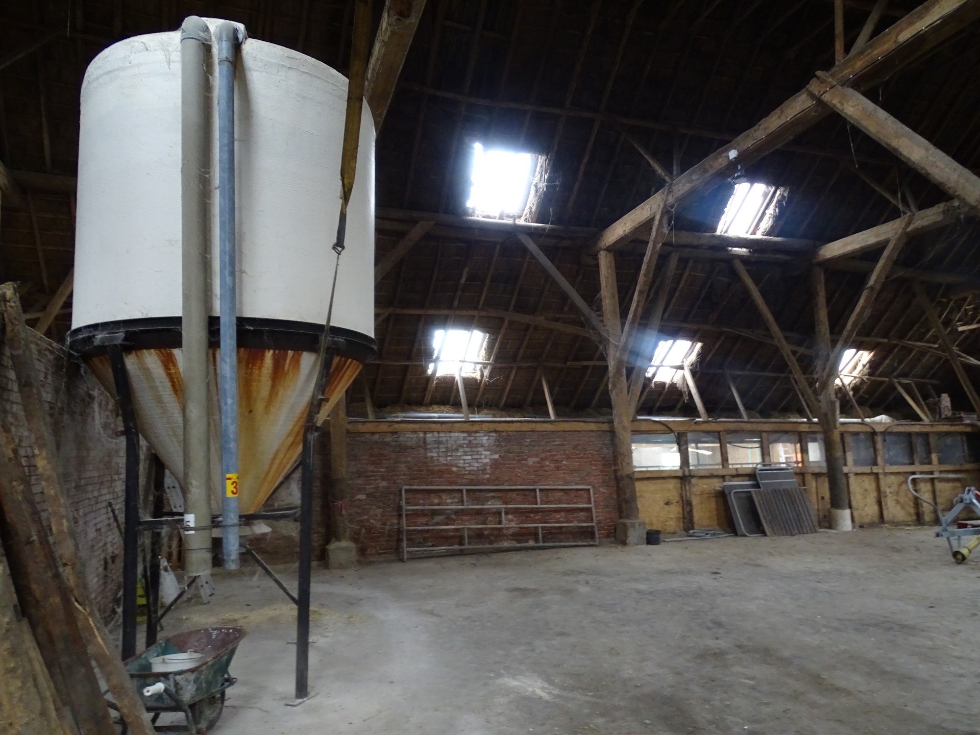 De ruimte is voorzien van steens muren, een traditionele gebintconstructie en een extra stalen ligger ter ondersteuning van de balkconstructie. De vloer is uitgevoerd in beton.