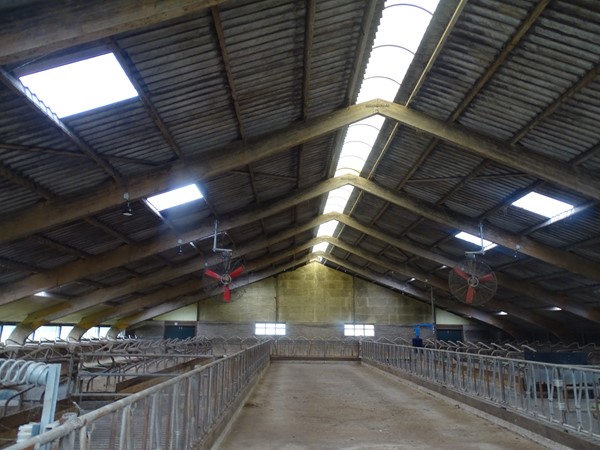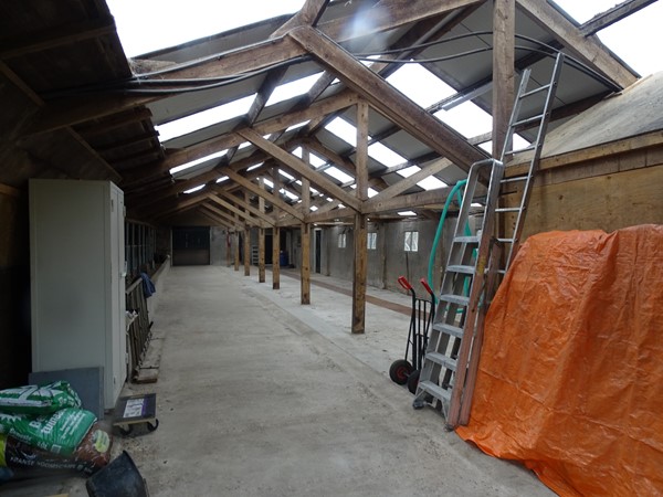 De constructie bestaat uit houten boogspanten, wat zorgt voor een ruime en open binnenruimte. Het dak is gedekt met ABC-golfplaten en rondom is de stal uitgevoerd met spouwmuren, wat bijdraagt aan de degelijkheid en isolerende eigenschappen van het gebouw. De stal is ingericht met diepstrooiselboxen, die destijds zorgden voor een comfortabele en diervriendelijke ligplaats voor het vee.