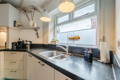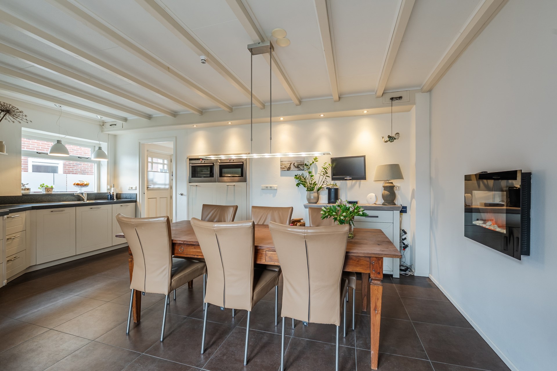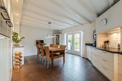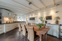 - Woonkeuken met plavuizen vloer en vloerverwarming. Voorzien van stoomoven, oven, koelkast, 5-pits inductiekookplaat, afzuigkap, vaatwasser en openslaande deuren naar het terras