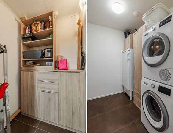 - Bijkeuken met plavuizen vloer, wasmachine-/droger aansluiting en cv-opstelling