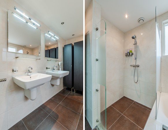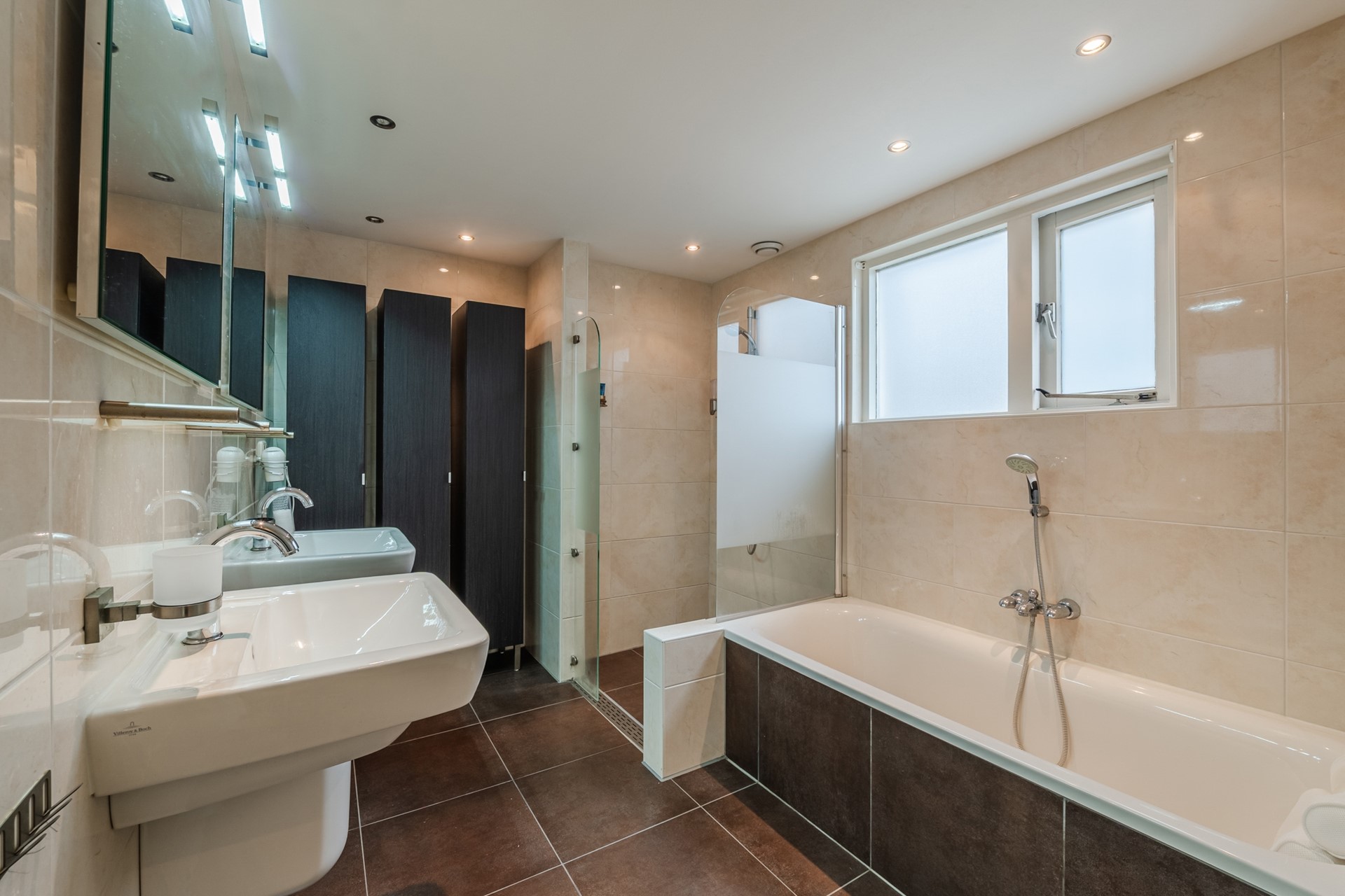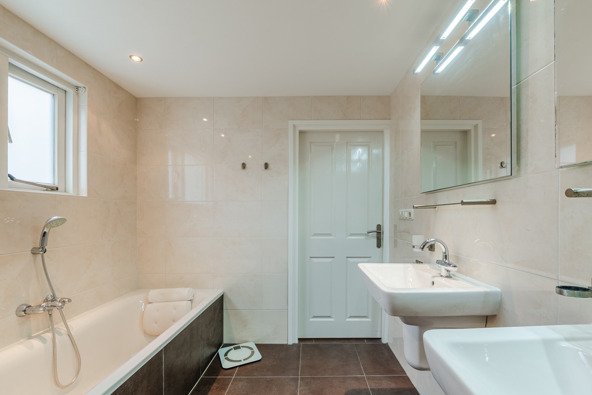 - Badkamer met inloopdouche, dubbele wastafel, ligbad, 3 kasten en plavuizen vloer met vloerverwarming