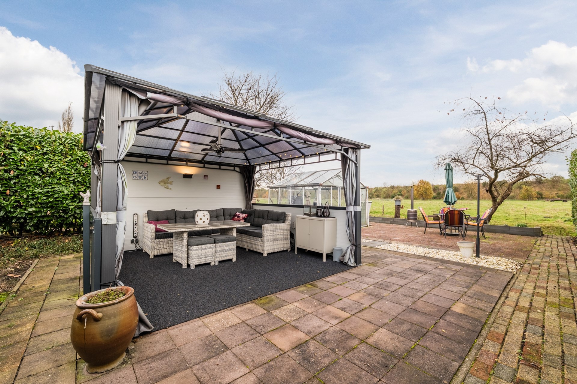 - Diepe achtertuin met prieel en kas