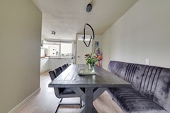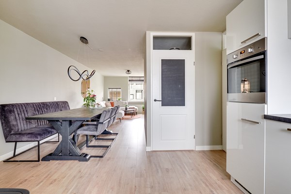 De woonkamer is licht en uitnodigend. Grote ramen zorgen voor een prettige lichtinval gedurende de dag, terwijl de indeling je alle vrijheid geeft voor een comfortabele zithoek én een eettafel waar je rustig kunt ontbijten, werken of gasten ontvangt. Dit is zo’n ruimte waar je ’s avonds thuiskomt, schoenen uitschopt en denkt: ja, dit zit goed.