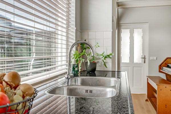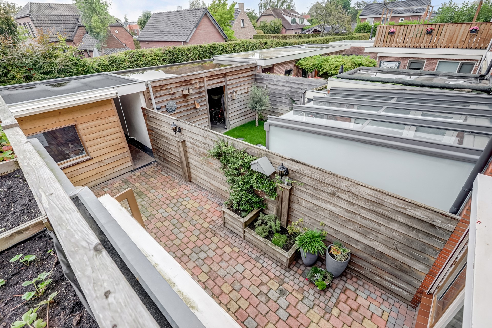 De zonnige achtertuin op het westen is verzorgd en is voorzien van grote bering van ca. 10m². De tuin heeft een achterom.