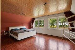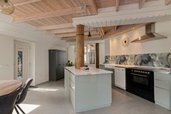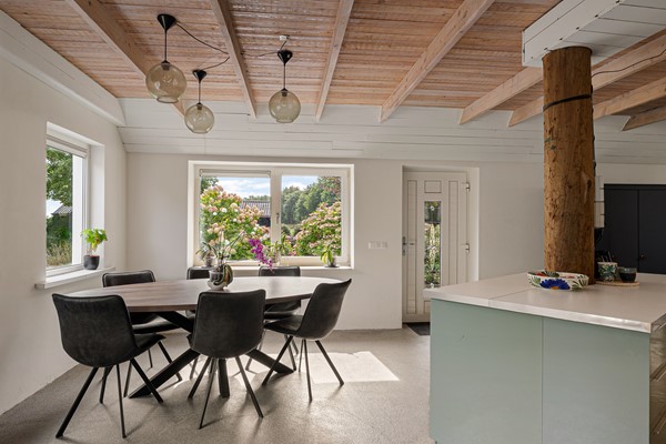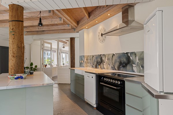 De woonkeuken is royaal en voorzien van een kookeiland en een keuken over de breedte. Er is plek voor een grote eettafel om met je familie en vrienden te eten. De keuken is afgesloten van de woonkamer. Met een deur bereik je de L-vormige woonkamer met een krachtige houtkachel. Prachtig is het uitzicht op het water. Je stapt via de openslaande deuren het terras op.