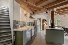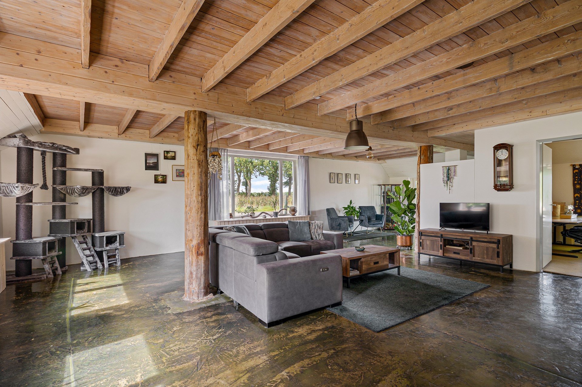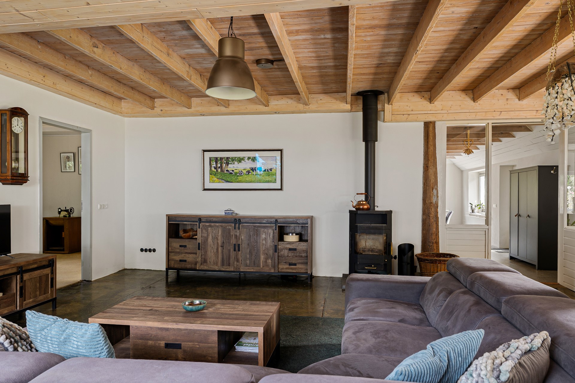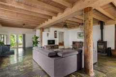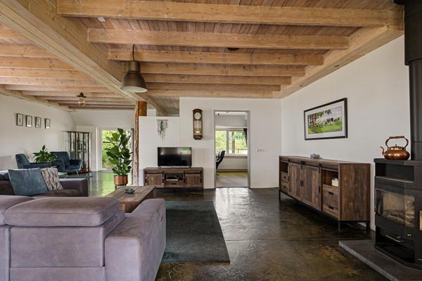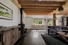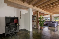 Op de begane grond vind je zowel de houten balkenplafond als de houten gebinten in het zicht. De betonvloer is gecoat en de stoere uitstraling past bij de robuuste oppervlakte van de leefruimte op de begane grond.