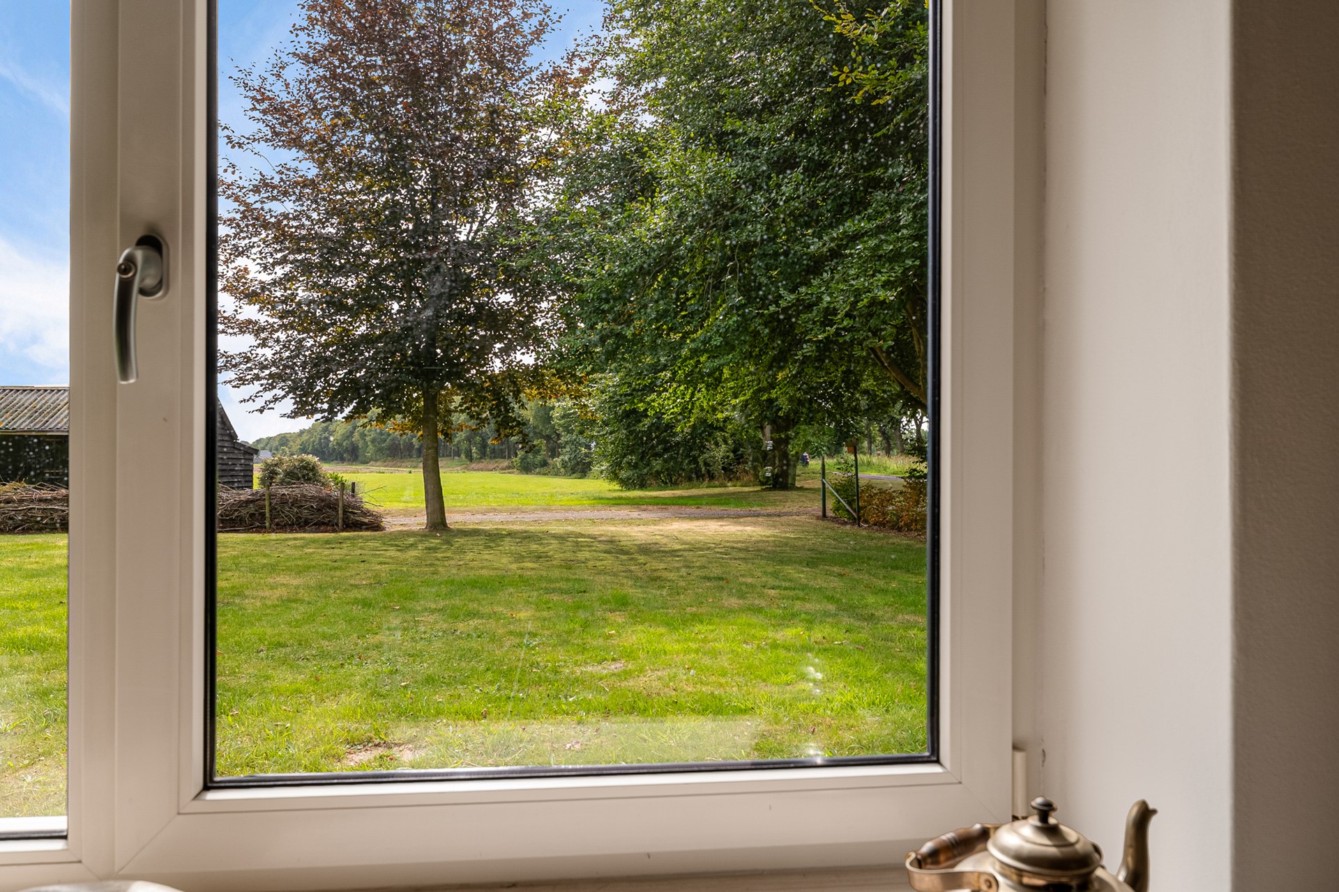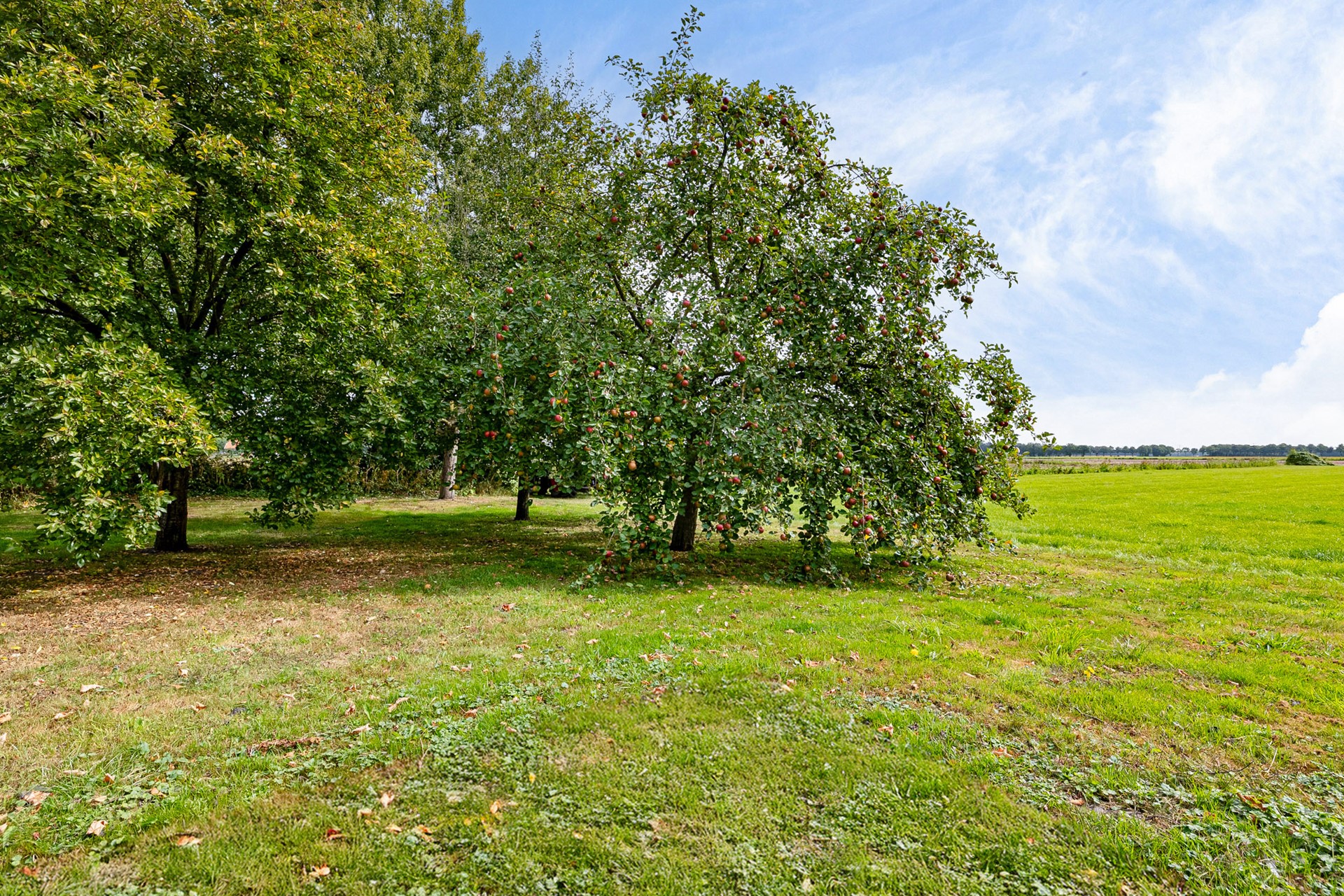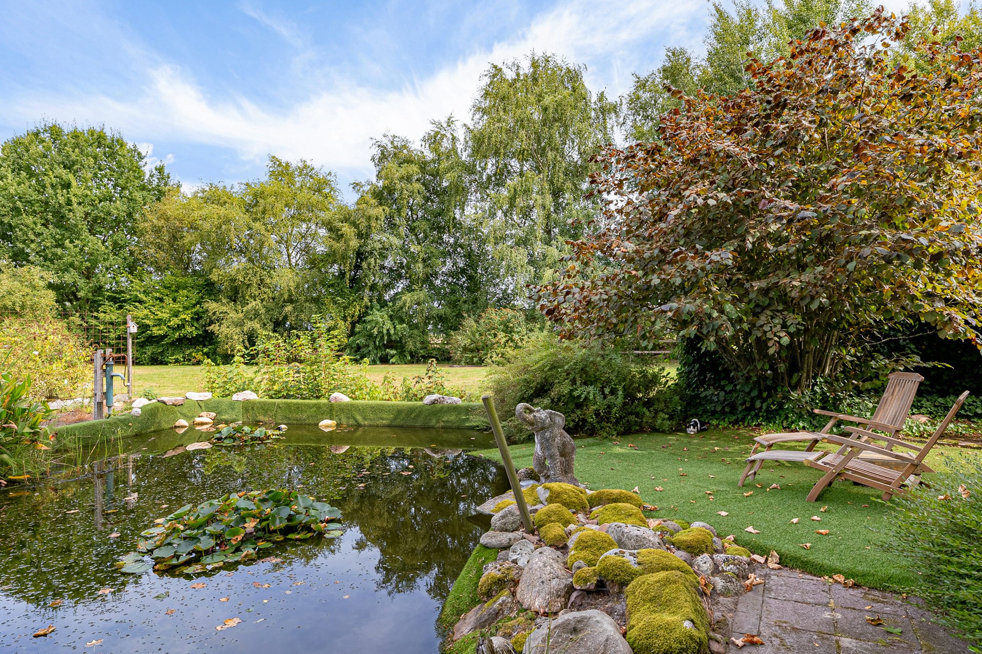 De royale vijver geeft een mooie invulling aan de tuin, samen met alle fruitbomen. De erfgrens van de kavel is goed zichtbaar, de buren niet want de afstand is ver genoeg om heerlijk te genieten van je privacy.