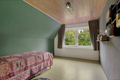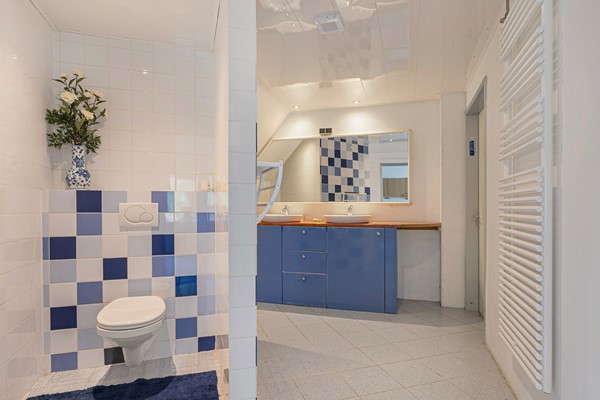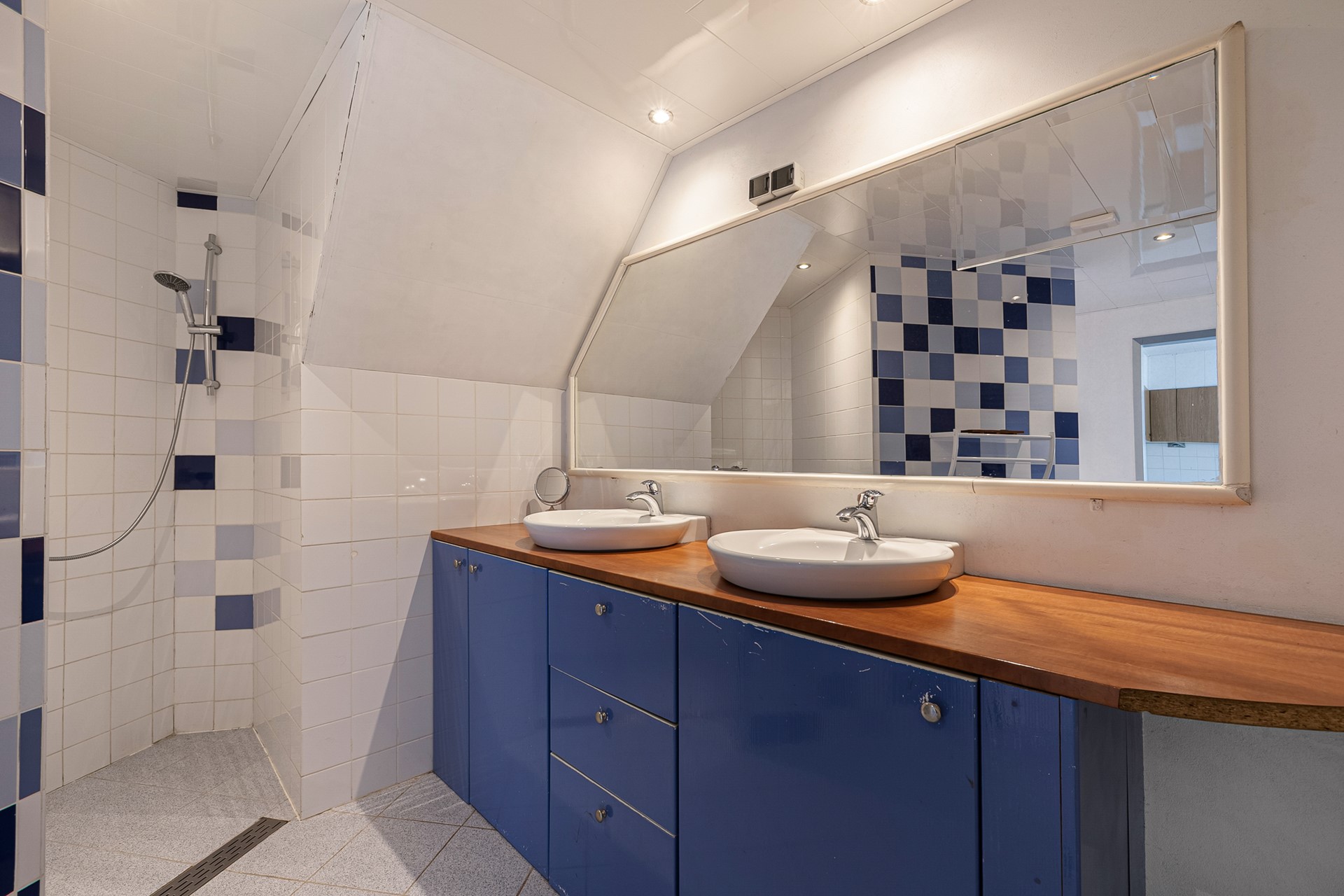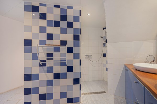 Vanuit de woonkamer bereik je de (slaap)kamer op de begane grond met een doorloop naar de royale badkamer. De badkamer is compleet betegeld en voorzien van een toilet, een dubbele wastafelmeubel en een inloopdouche.
