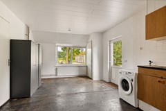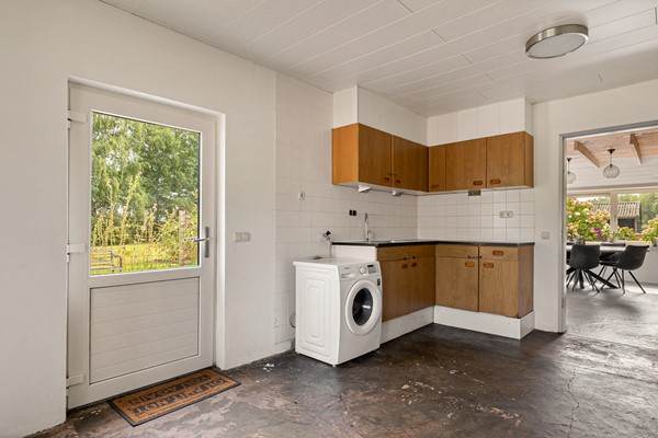 Je kunt op twee manieren de woning binnenstappen, via de bijkeuken of via de leefkeuken. In de bijkeuken vind je de witgoedaansluitingen en een keukenblok en toegang tot zowel de inpandige berging als de badkamer op de begane grond.