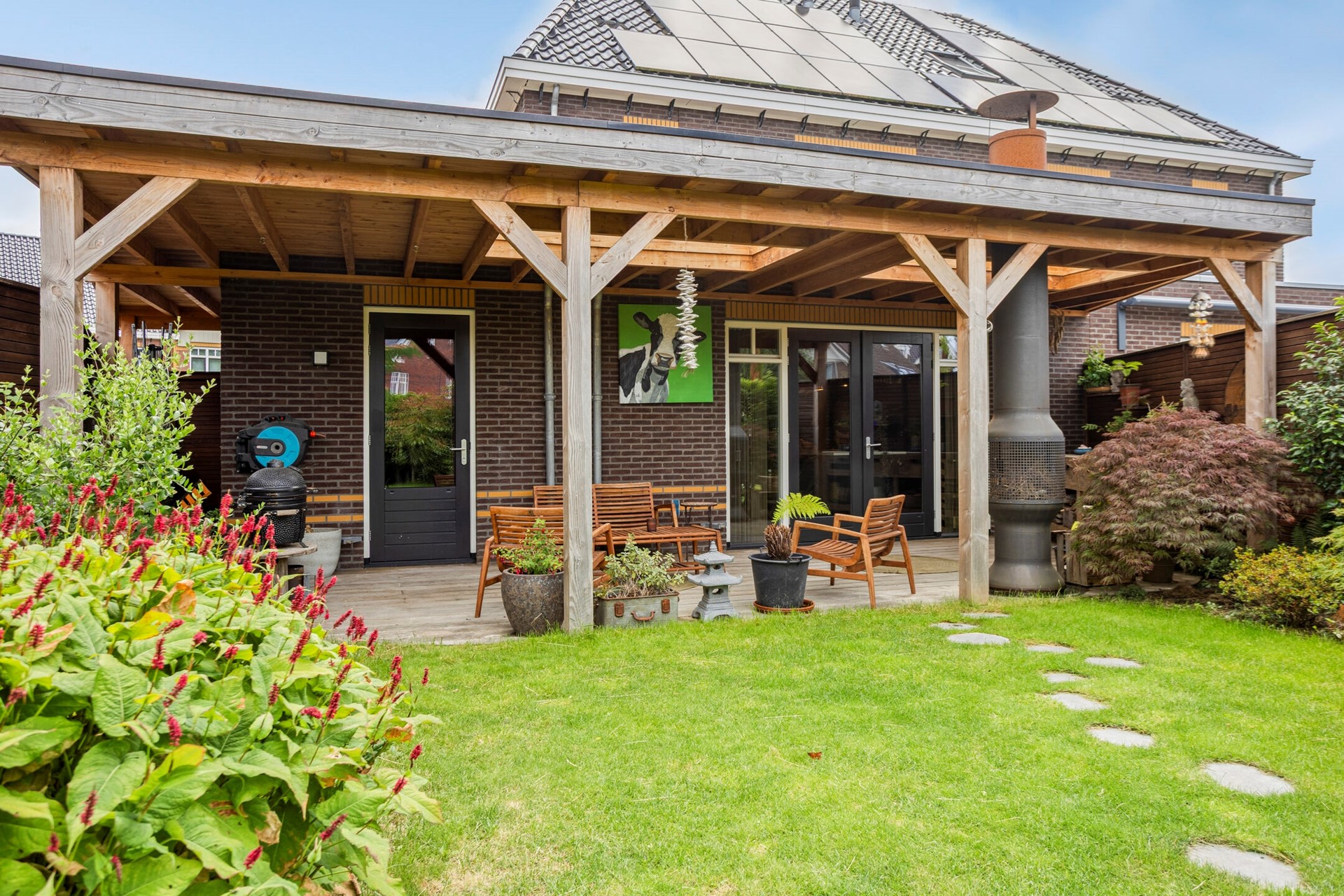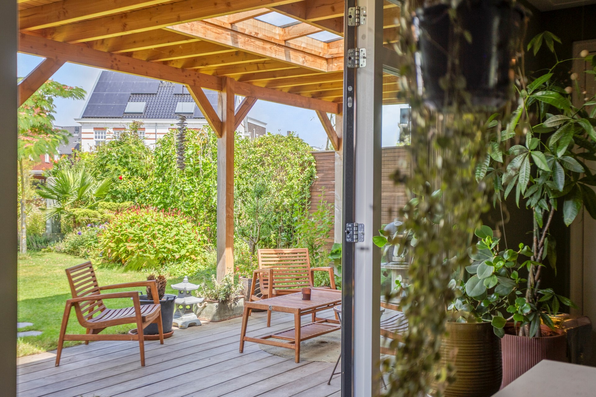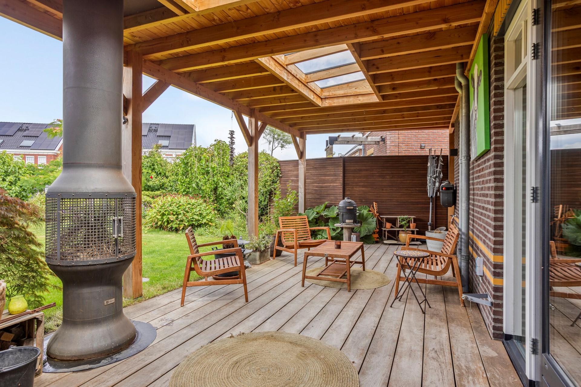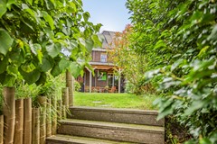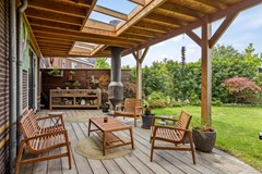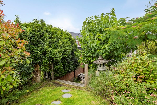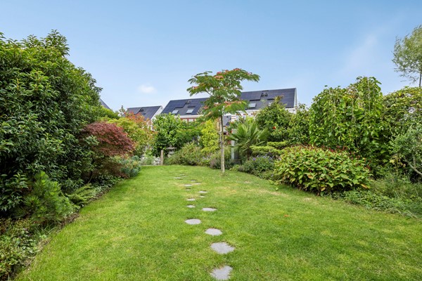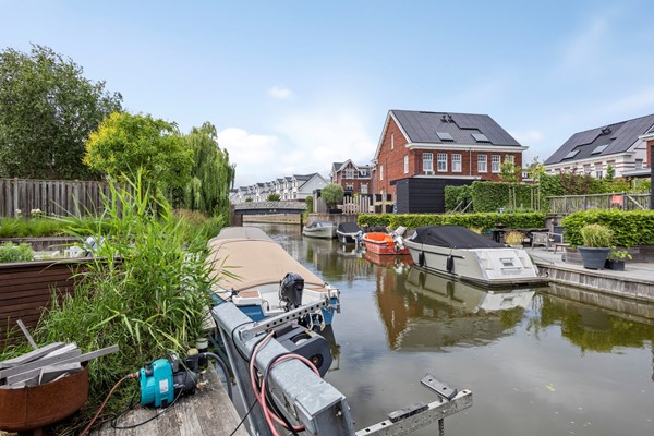 De diepe en fleurige achtertuin heeft -aan het huis vast- over de gehele breedte een sfeervolle overkapping met buitenhaard. Achter in de tuin is ook een flink terras met eigen aanlegsteiger met botenlift. Vanaf hier vaart u heerlijk de Oude Rijn op... en verder. Het centrum van Leiden, de Kagerplassen of via het Oegstgeesterkanaal verder tot aan de Noordzeekust. Je raakt nooit uitgekeken onderweg met wisselende vergezichten en leuke restaurantjes die je 'pad' kruisen.