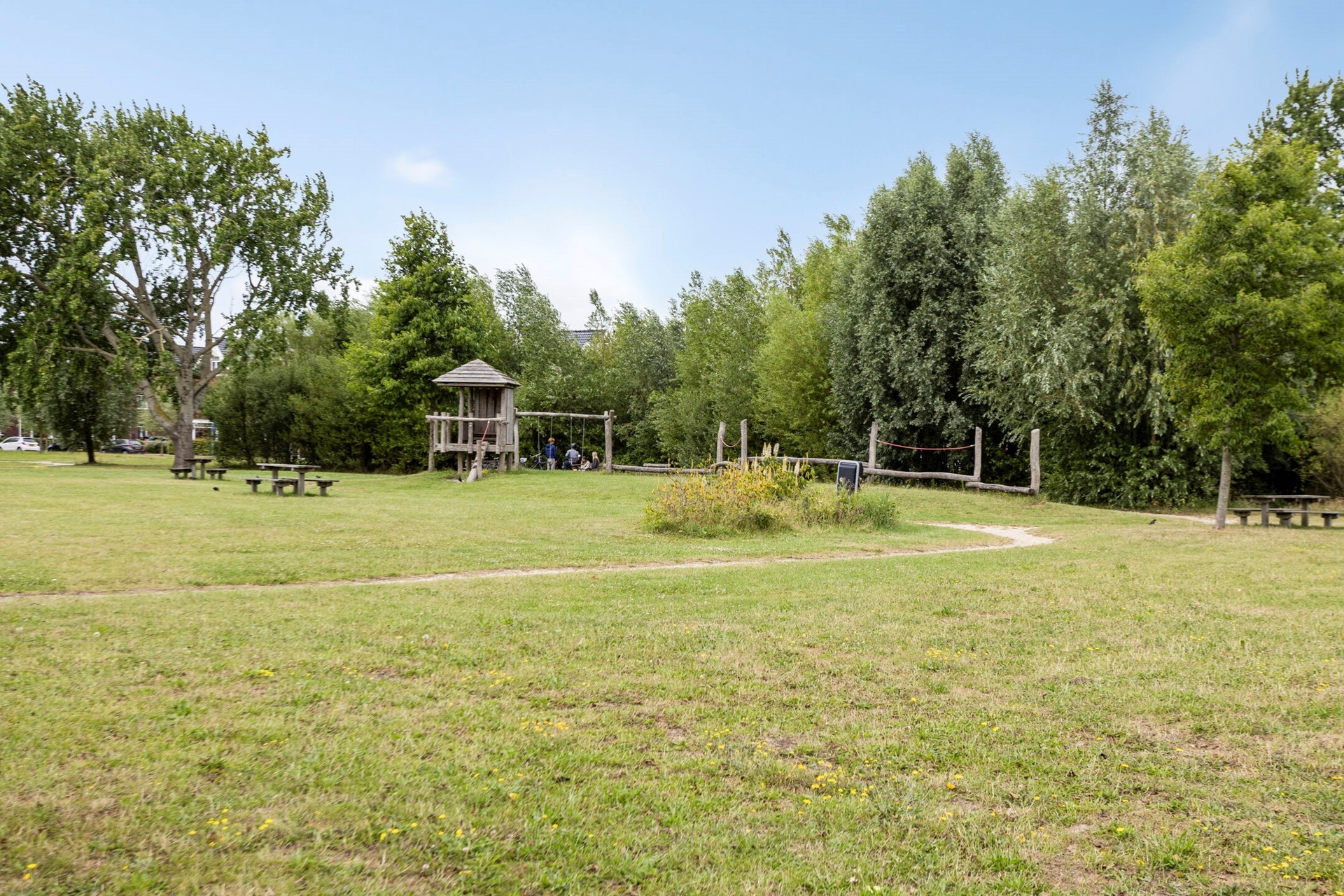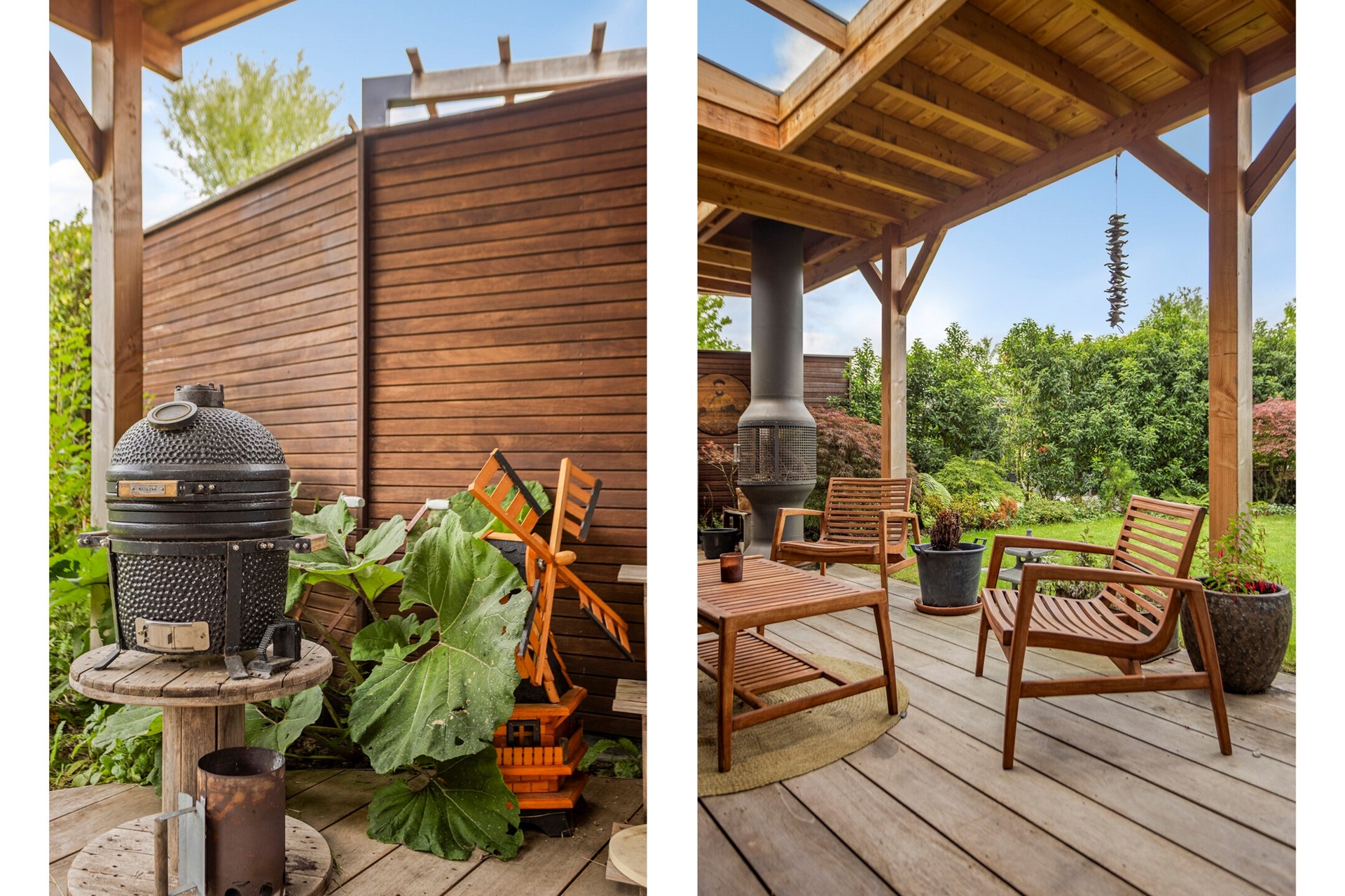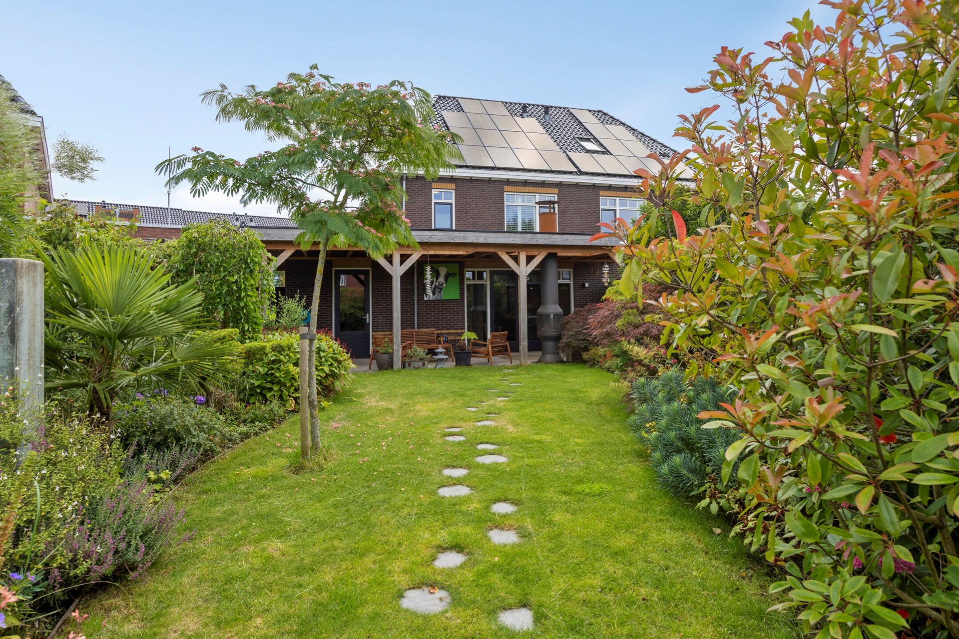 De diepe en fleurige achtertuin heeft -aan het huis vast- over de gehele breedte een sfeervolle overkapping met buitenhaard. Achter in de tuin is ook een flink terras met eigen aanlegsteiger met botenlift. Vanaf hier vaart u heerlijk de Oude Rijn op... en verder. Het centrum van Leiden, de Kagerplassen of via het Oegstgeesterkanaal verder tot aan de Noordzeekust. Je raakt nooit uitgekeken onderweg met wisselende vergezichten en leuke restaurantjes die je 'pad' kruisen.
