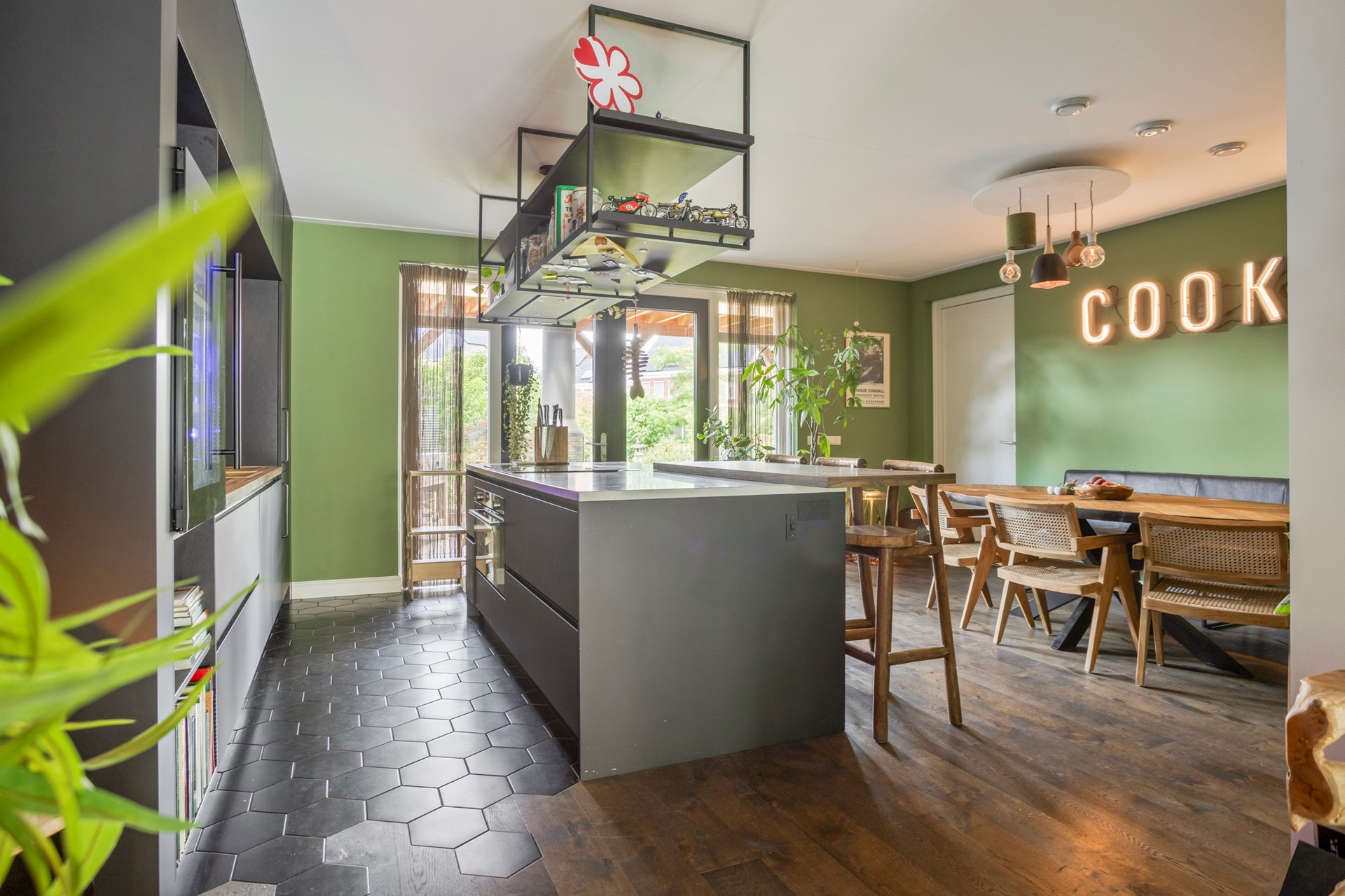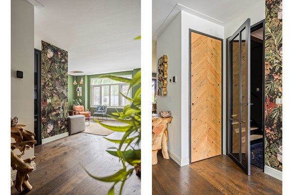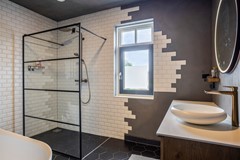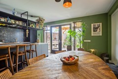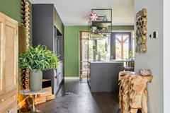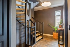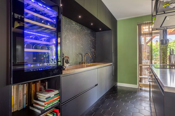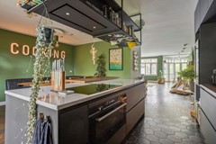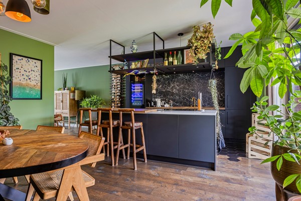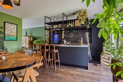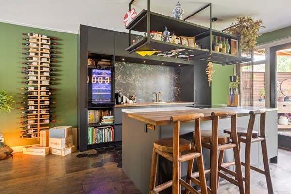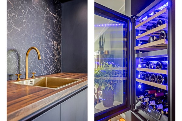 Bij binnenkomst aan de zijkant van de woning komt u in de hal met aan de linkerzijde de meterkast en een kast voor de warmtepomp en aan de rechterzijde een modern toilet met fonteintje. De riante woonkamer heeft een handige trapkast en aan de voorzijde een sfeervolle erker met veel glas en aan de achterzijde is er de open keuken. Deze luxe keuken heeft een kookeiland en is van alle gemakken voorzien (o.a. koel-/vriescombinatie, inductie kookplaat, oven, wijnkoelkast en vaatwasser).