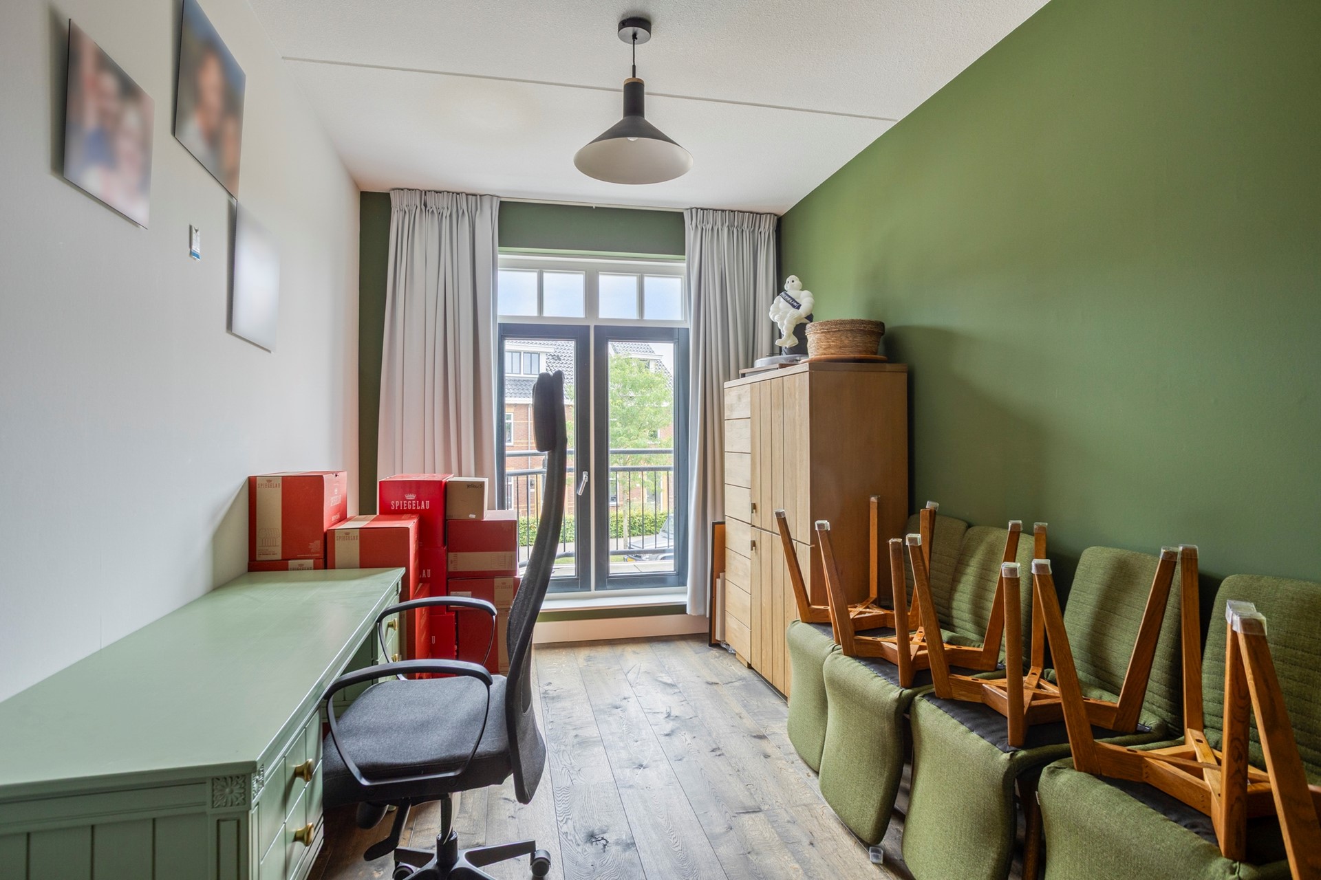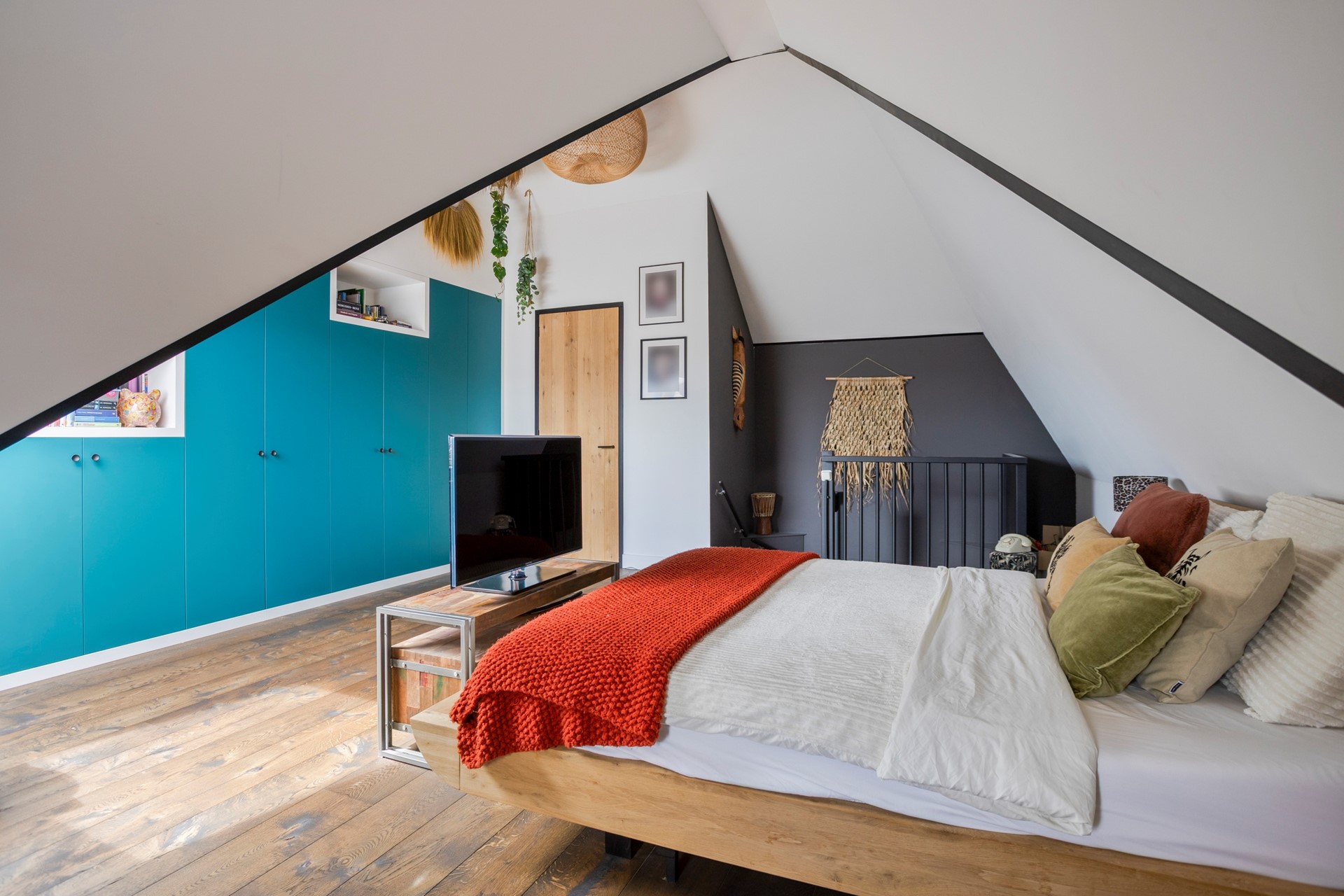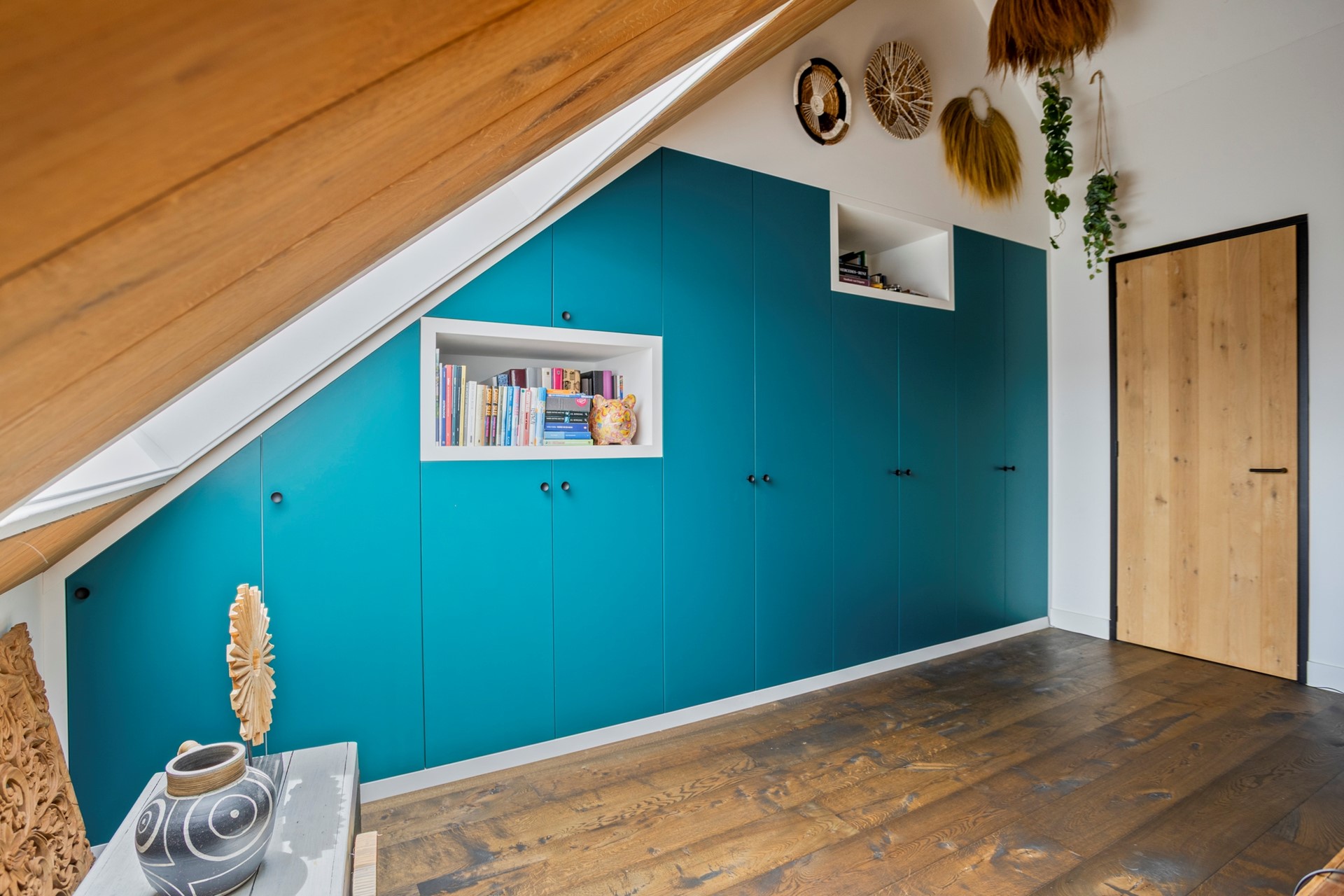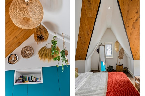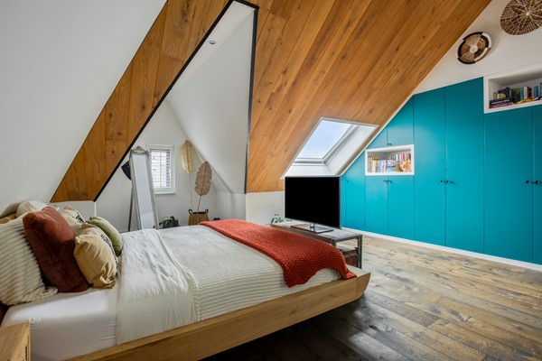 De huidige bewoners hebben hier nu één grote open slaapkamer van gemaakt met een stijlvolle kastenwand. Verder is er een zeer ruime berging/technische ruimte waar een tweede aansluiting voor de wasmachine zit. Ook deze verdieping heeft weer houten vloerdelen.