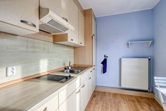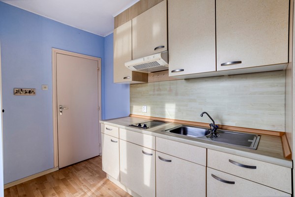 Op de eerste verdieping bevinden zich 2 slaapkamers, een badkamer en een keuken. De slaapkamers zijn afgewerkt met een laminaatvloer zijn respectievelijk circa 17 en 14 m² groot. De voormalige derde slaapkamer is voorzien van een keukenopstelling, een muurkast en heeft toegang tot het balkon. De badkamer is voorzien van een ligbad-/douchecombinatie, badkamermeubel met wastafel en een toilet.