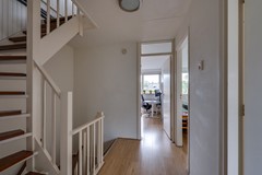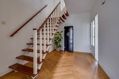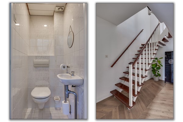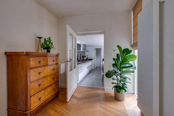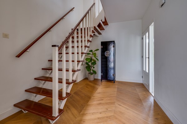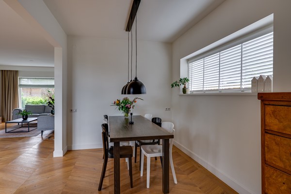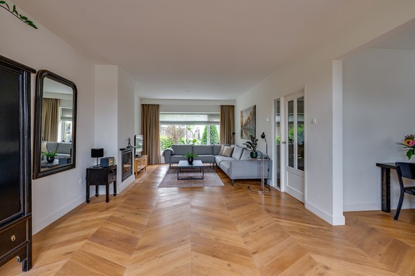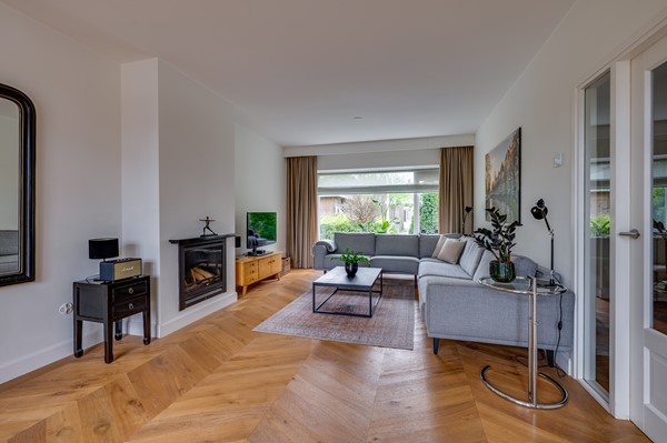De begane grond heeft een ruime entree met tochtportaal en een hal met toilet. De woonkamer is verrassend licht dankzij de grote raampartijen en de uitbouw aan de achterzijde. Aan de voorzijde bevindt zich de zithoek met sfeervolle haard; aan de achterzijde is ruimte voor een extra zithoek en een royale eettafel met uitzicht op de tuin. De openslaande deuren zorgen voor extra lichtinval en verbinden de woonkamer op een prettige wijze met buiten. De houten Hongaarse puntvloer zorgt voor een warme uitstraling.