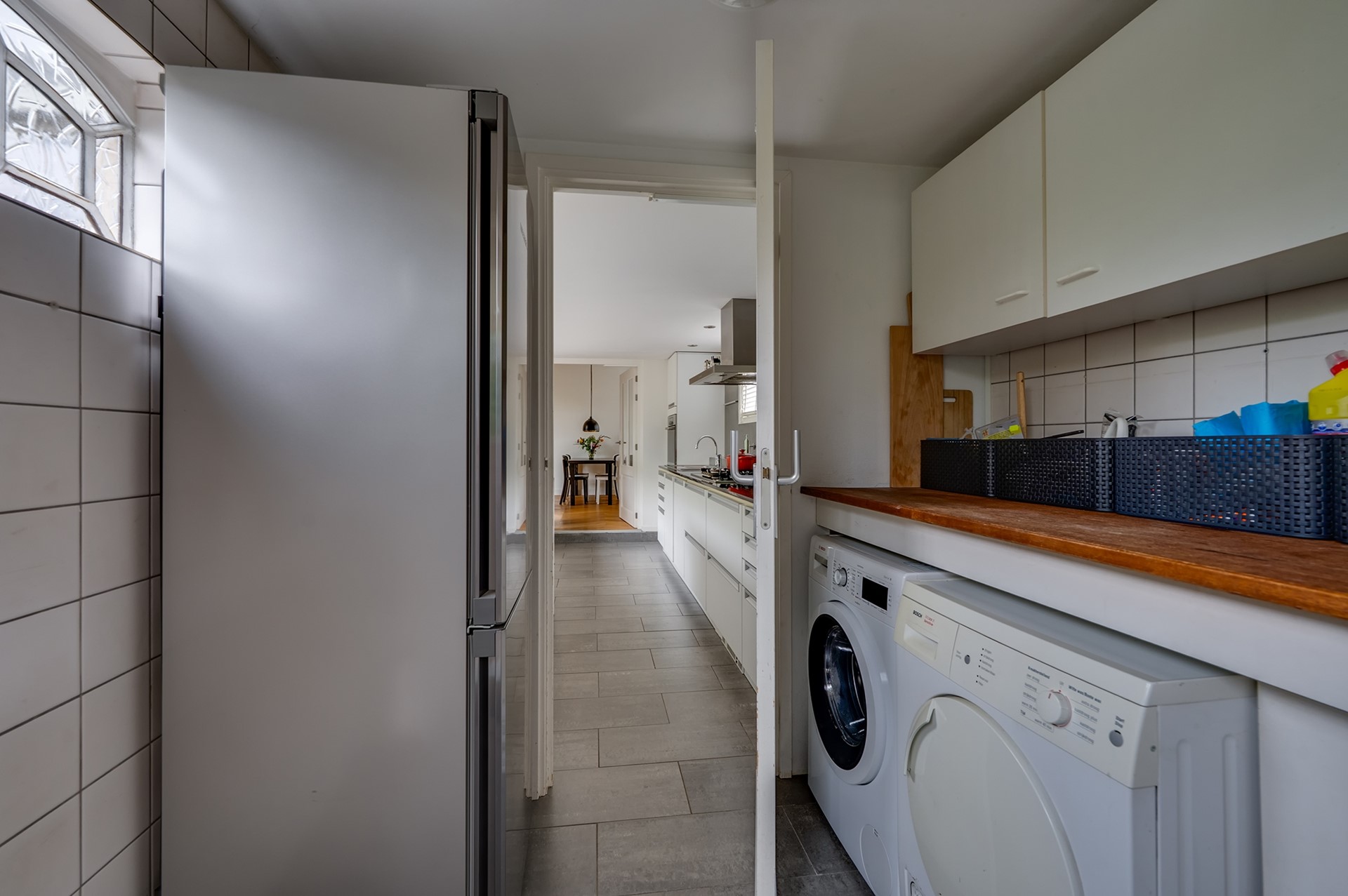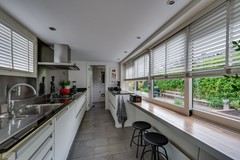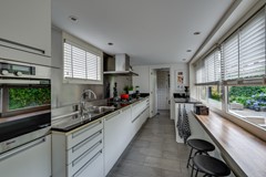 De keuken is uitgevoerd in wit met een donker natuurstenen werkblad en biedt veel werk- en bergruimte. De bar bij het raam is een fijne plek voor een kop koffie met uitzicht op de tuin of een gezellig zitje tijdens het koken. Aansluitend bevindt zich de bijkeuken, met ruimte voor de wasmachine en droger. Vanuit hier is de tuin eveneens bereikbaar, waar een overkapping doorloopt naar de vrijstaande garage.