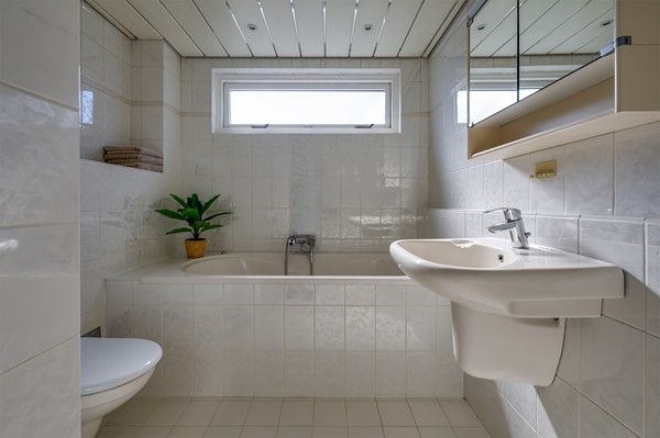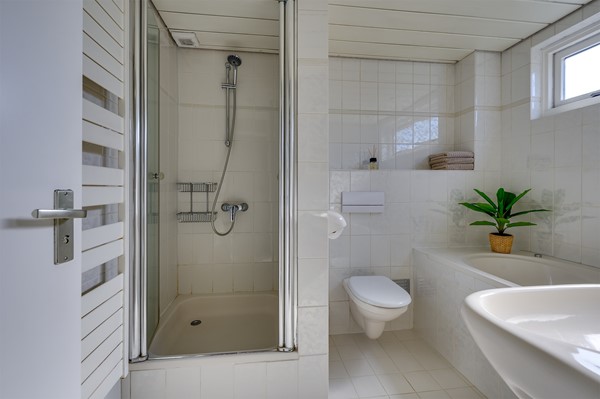 De overloop op de eerste verdieping geeft toegang tot drie ruime slaapkamers en de badkamer. Twee slaapkamers hebben vaste kasten; de derde slaapkamer beschikt over een balkon. De badkamer is uitgevoerd in neutrale tinten en voorzien van een ligbad, douche, toilet en wastafel. Dankzij het raam beschikt de ruimte over prettig daglicht en goede ventilatie.
