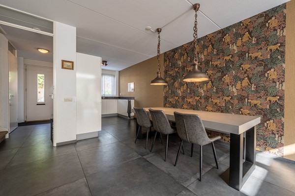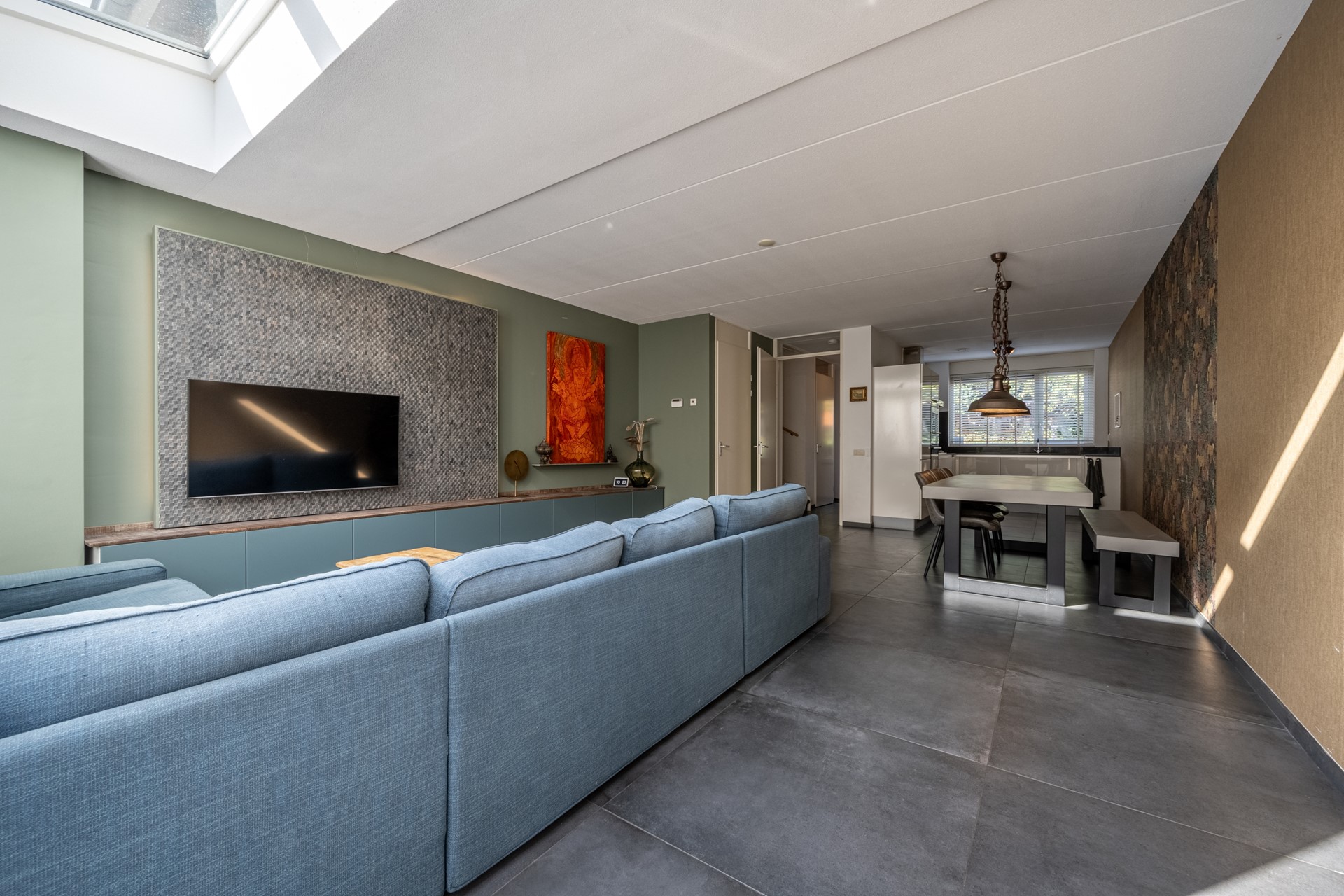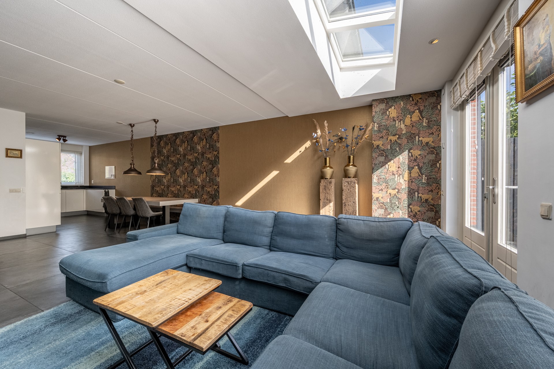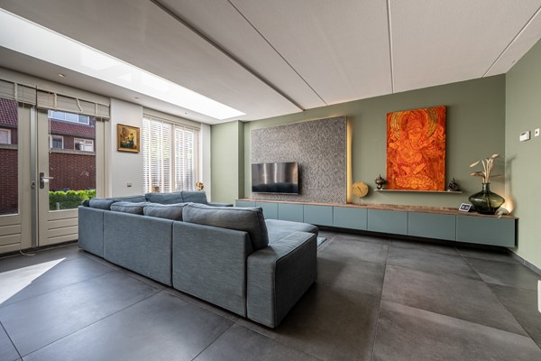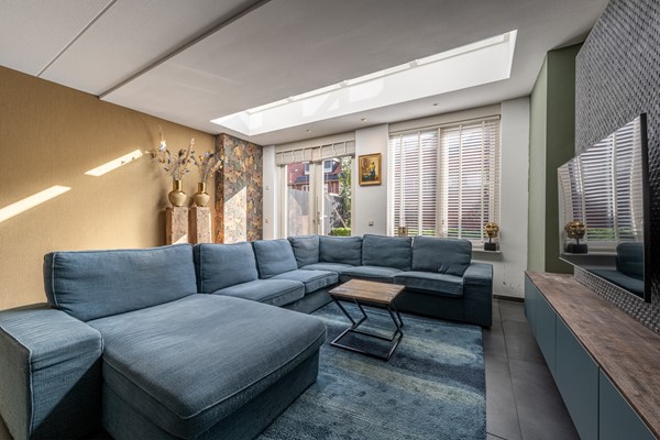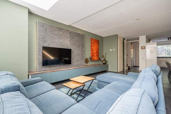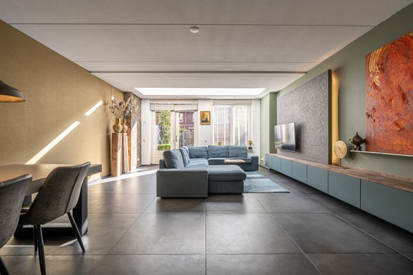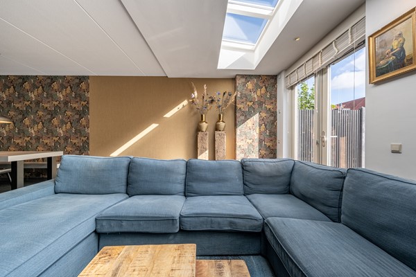 De woonkamer is een heerlijke leefruimte waar licht en comfort centraal staan. Dankzij de grote ramen, lichtkoepels en de openslaande deuren richting de achtertuin geniet je hier de hele dag van natuurlijk daglicht. De uitgebouwde zithoek biedt volop ruimte voor een royale bank en een gezellige eethoek. De strakke vloer met vloerverwarming zorgt niet alleen voor een moderne uitstraling, maar ook voor aangenaam wooncomfort gedurende het hele jaar.