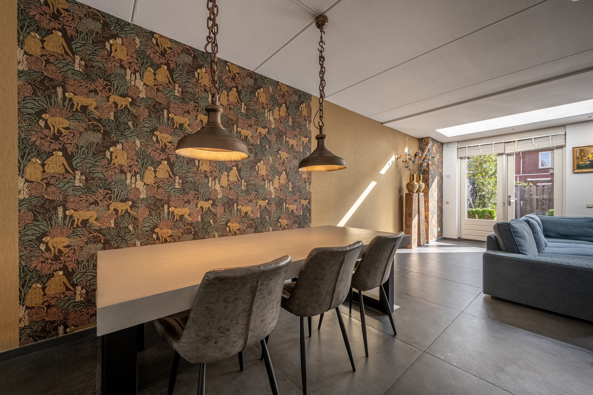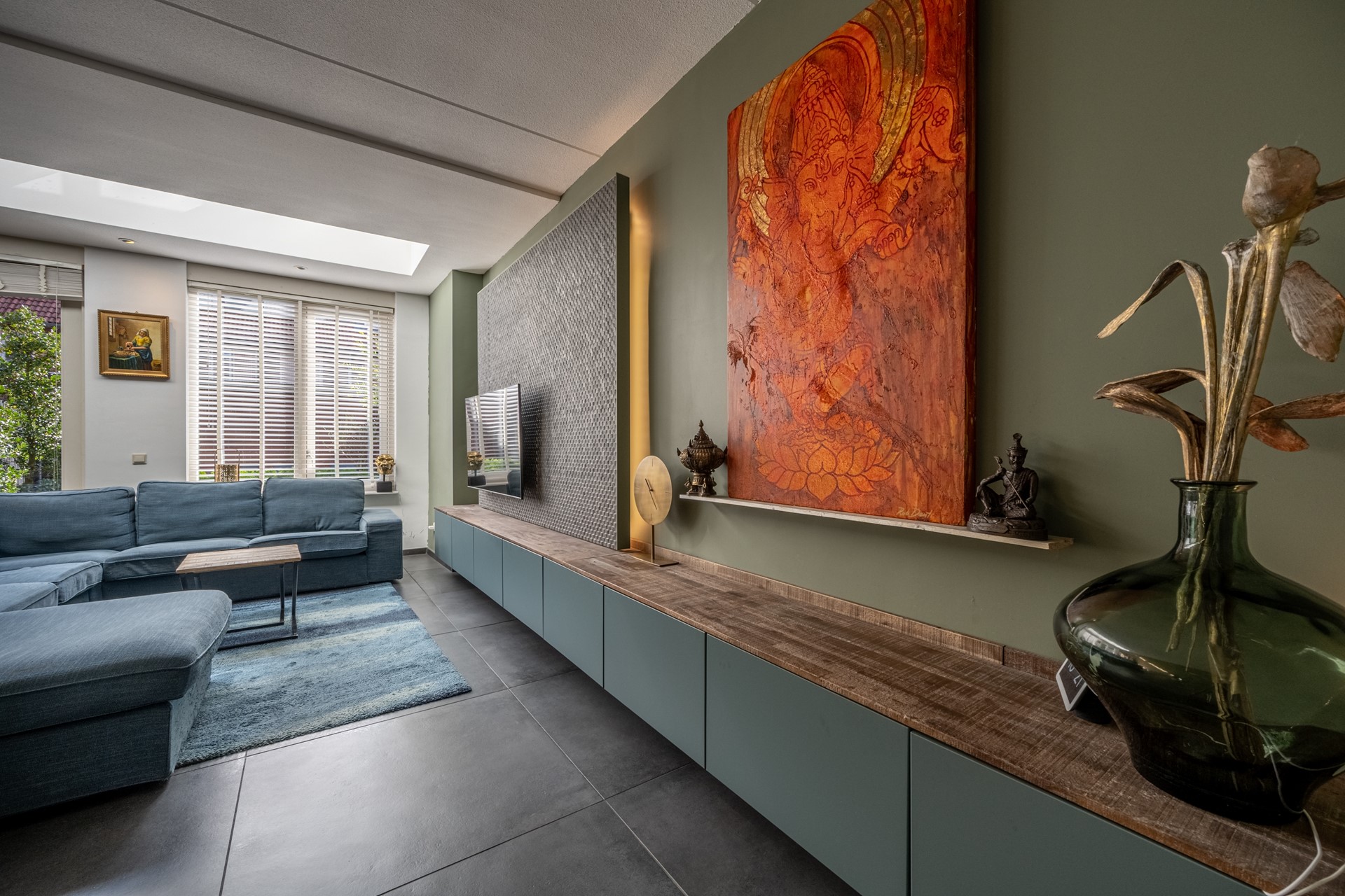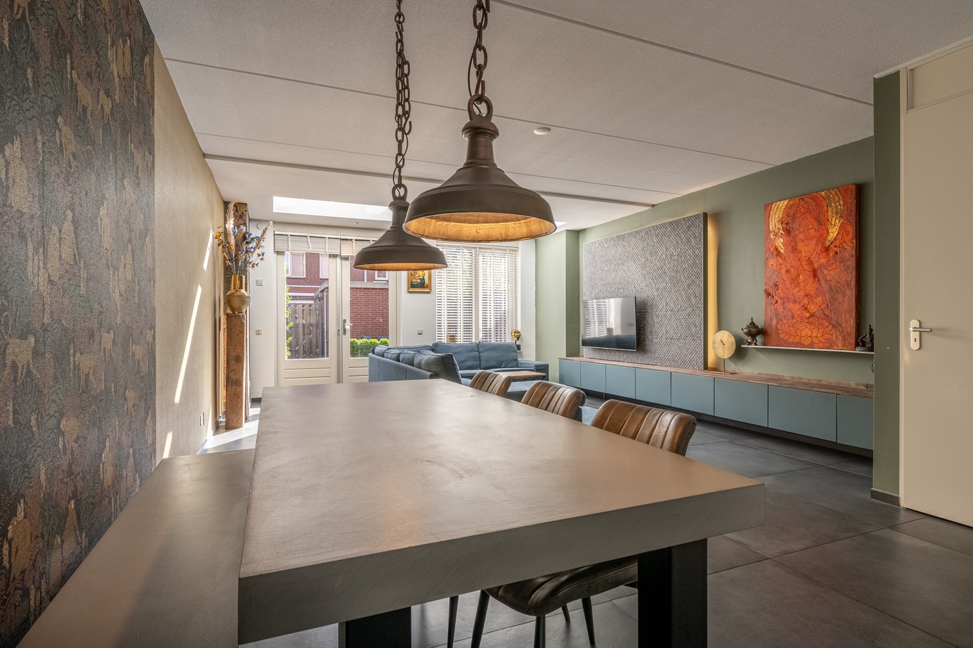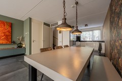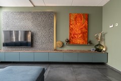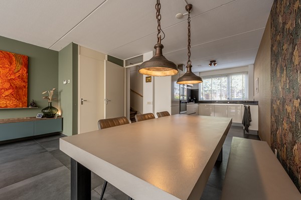 De woonkamer is een heerlijke leefruimte waar licht en comfort centraal staan. Dankzij de grote ramen, lichtkoepels en de openslaande deuren richting de achtertuin geniet je hier de hele dag van natuurlijk daglicht. De uitgebouwde zithoek biedt volop ruimte voor een royale bank en een gezellige eethoek. De strakke vloer met vloerverwarming zorgt niet alleen voor een moderne uitstraling, maar ook voor aangenaam wooncomfort gedurende het hele jaar.