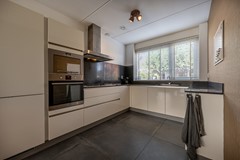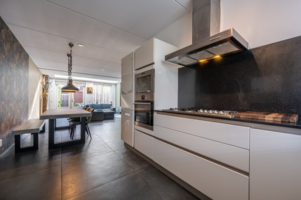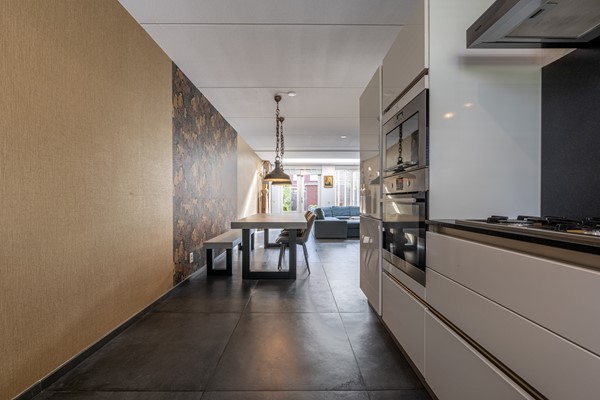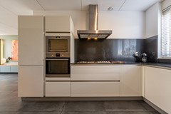 Aan de voorzijde van de woning bevindt zich de moderne open keuken. Deze is praktisch ingedeeld en voorzien van diverse inbouwapparatuur, waaronder een 5-pitsgaskookplaat, afzuigkap, combimagnetron, oven, vaatwasser en koel-vriescombinatie. Dankzij de ruime kasten en lades is er voldoende bergruimte en kun je hier met plezier koken en tafelen.