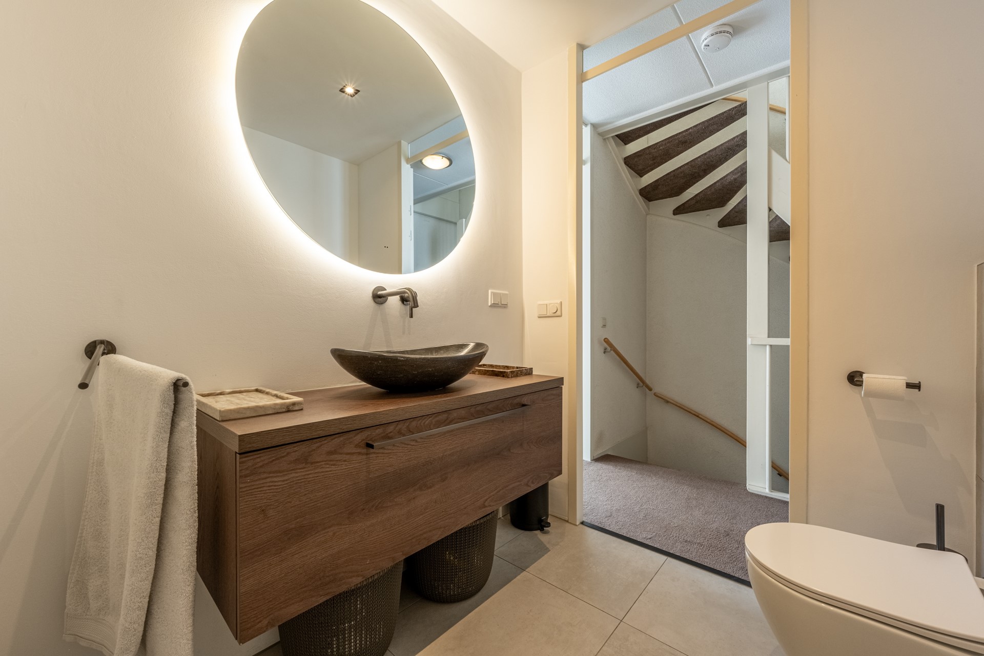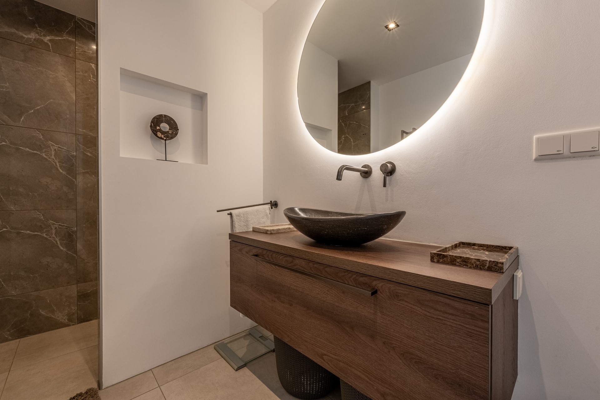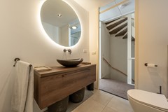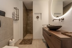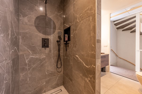 De moderne badkamer straalt luxe uit en is voorzien van een ruime inloopdouche, een stijlvol wastafelmeubel met spiegel, een tweede toilet en hoogwaardige betegeling. Alles is tot in de puntjes afgewerkt, hier geniet je dagelijks van comfort en rust.