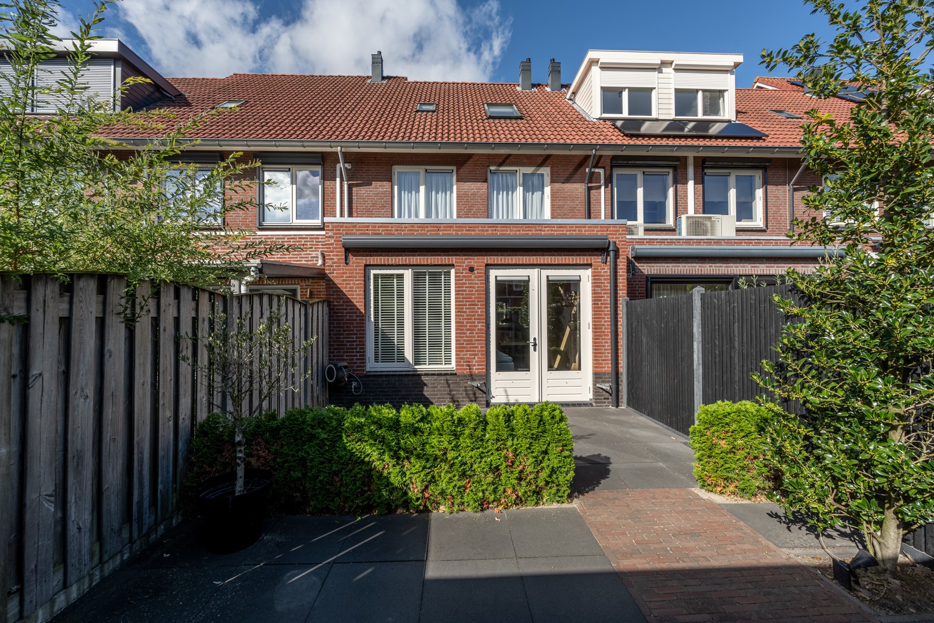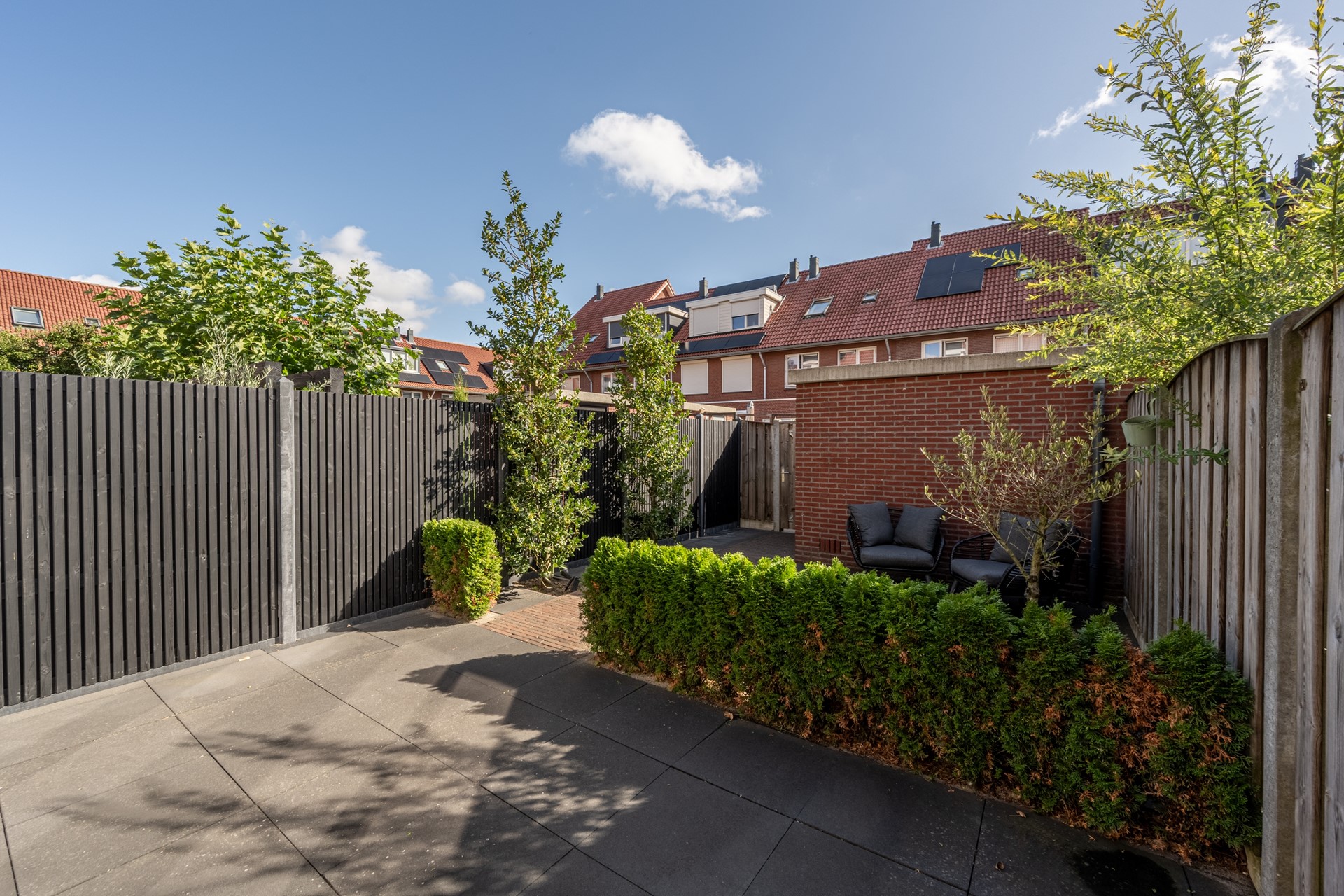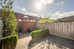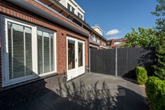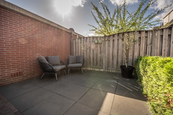 De achtertuin is in 2021 volledig vernieuwd en gelegen op het oosten, waardoor je hier in de ochtend- en vroege middagzon heerlijk kunt genieten van een kop koffie of een goed boek. De tuin is modern en onderhoudsvriendelijk aangelegd, met een combinatie van bestrating, groen en een prettig terras. Dankzij het vernieuwde elektrische zonnescherm (2023) creëer je eenvoudig schaduw op warme dagen.