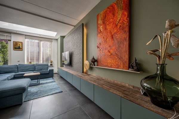 1. Uitgebouwde woonkamer (2018) met vloerverwarming en tuindeuren naar de fraai vernieuwde tuin