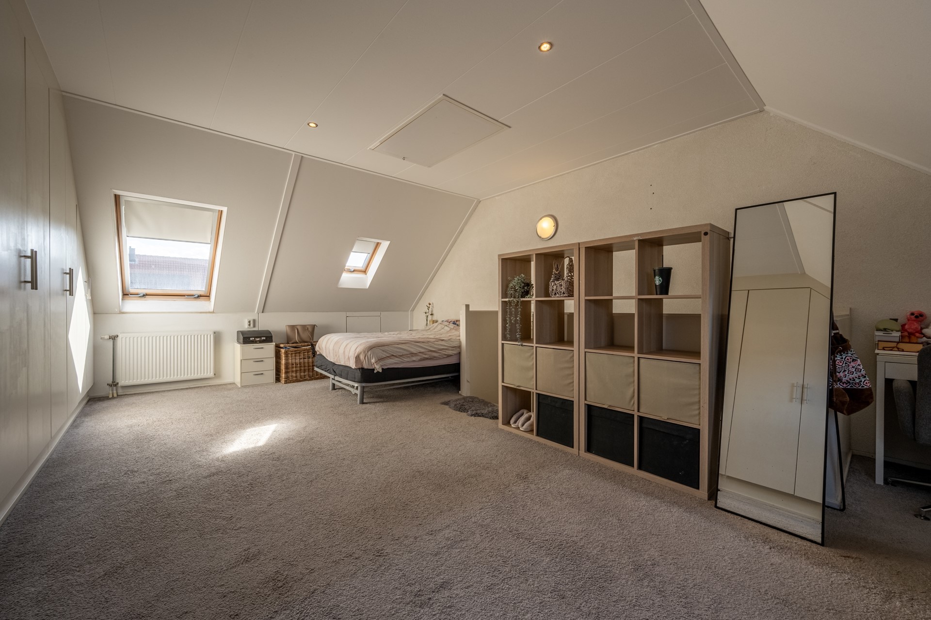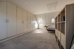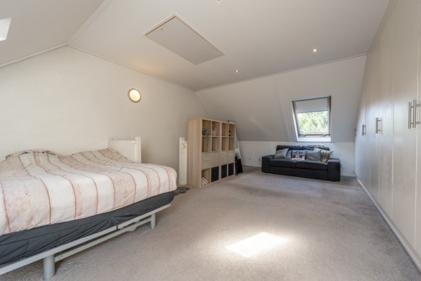 Via de vaste trap bereik je de ruime zolderverdieping. Deze open ruimte wordt momenteel gebruikt als vierde slaapkamer, maar biedt volop mogelijkheden. Met een dakkapel is hier eenvoudig een of zelfs twee volwaardige slaapkamers of een fijne thuiswerkplek te realiseren. De zolder beschikt over voldoende bergruimte achter de knieschotten en biedt plaats achter de kastenwand voor de wasapparatuur en de cv-installatie.