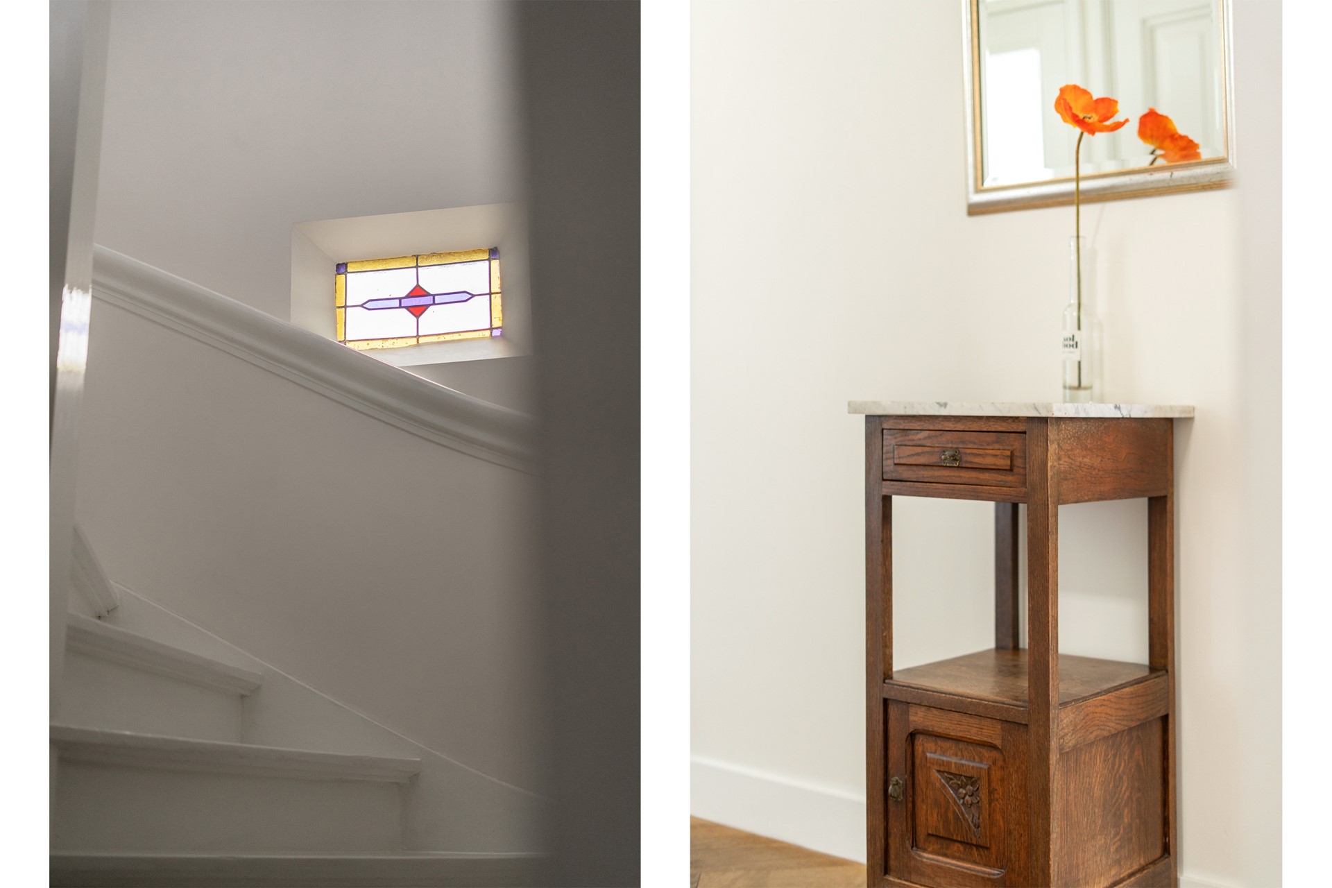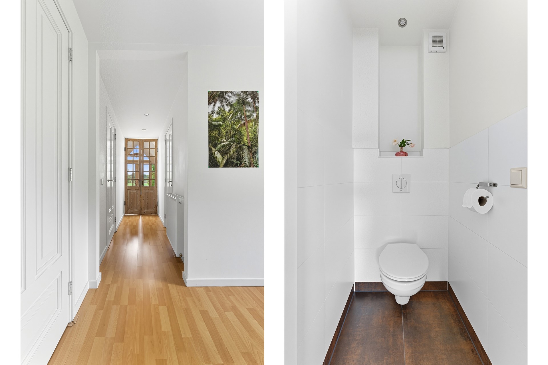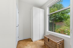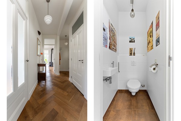 Je komt de woning binnen in de charmante en karakteristieke hal. Er is direct in de hal een aparte ruimte voor de wasmachine en garderobe. Er is ook een slaap-/werkkamer op de begane grond, ideaal als kantoor aan huis of als je de woning levensloopbestendig wil maken. Tevens is er in de hal een modern toilet, de charmante trap naar de 1e verdieping en toegang tot de kelder.