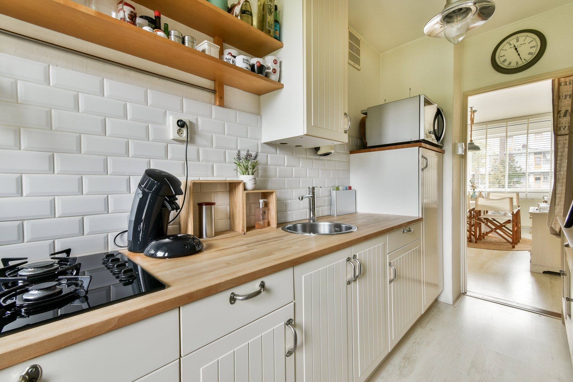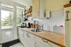 De keuken is praktisch ingericht en biedt voldoende kastruimte en werkblad. Vanuit hier bereik je het tweede balkon, waar je heerlijk kunt genieten van de middagzon met een kop koffie.
