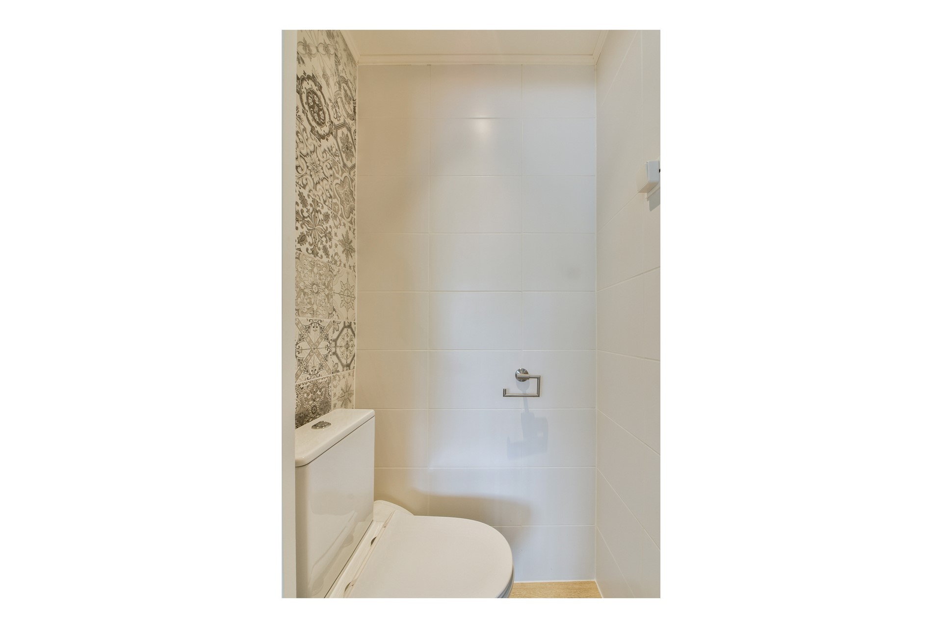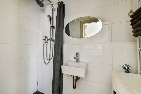 De badkamer is compact maar netjes en voorzien van een douche en wastafel. Daarnaast is er een separate toiletruimte, wat extra comfort biedt.